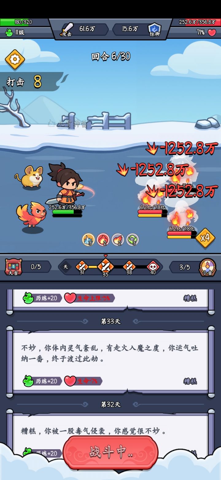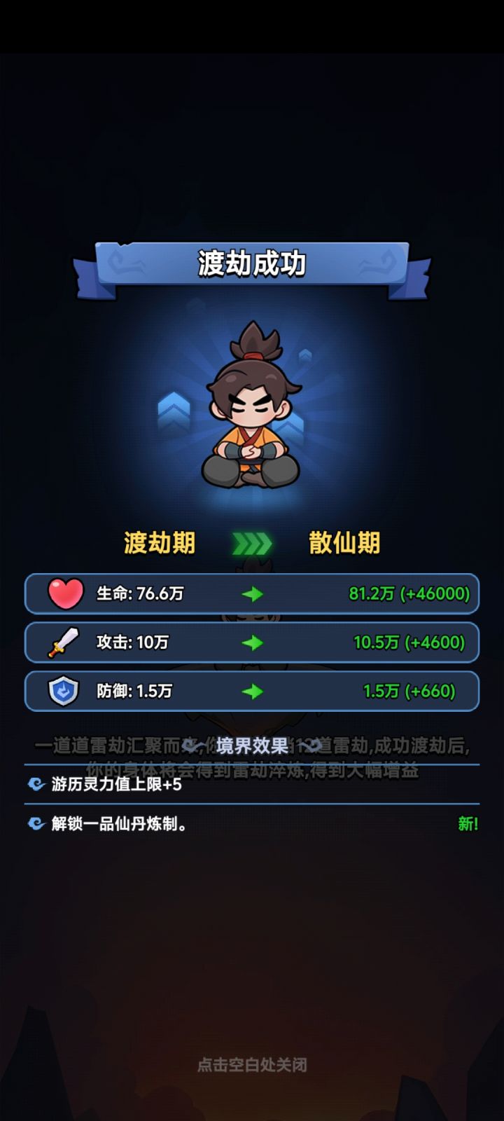 玩了十天,每天广告看满,终于成仙了,这游戏就暂时告一段落了,每天看广告太煎熬了。游戏的pvp是和这游戏的所有客户端玩家一起的。这游戏有微信小程序客户端,taptap开服晚,进度是落后的。最后,这游戏大乘期开了密宝,后面都是重复的内容,一眼望到头,请斟酌游玩,唯一的好处是不用氪金吧。