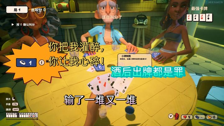 由Luski Game Studio制作CriticalLeap推出的多人卡牌对战游戏,创作灵感源自于巴西酒吧游戏,目前以抢先体验版本推出。玩家在开局前需要根据自己手握卡牌来下注觉得可以获胜的轮数,并在对局中获得对应的分数即可获胜,出局条件为喝满四杯酒。游戏规则还是比较简单易懂的,不过也不是一定的策略可玩性,对局过程中玩家可以使用特殊卡牌来扰乱其他人的节奏,玩着还挺有趣。游戏价格不算太贵,推荐和朋