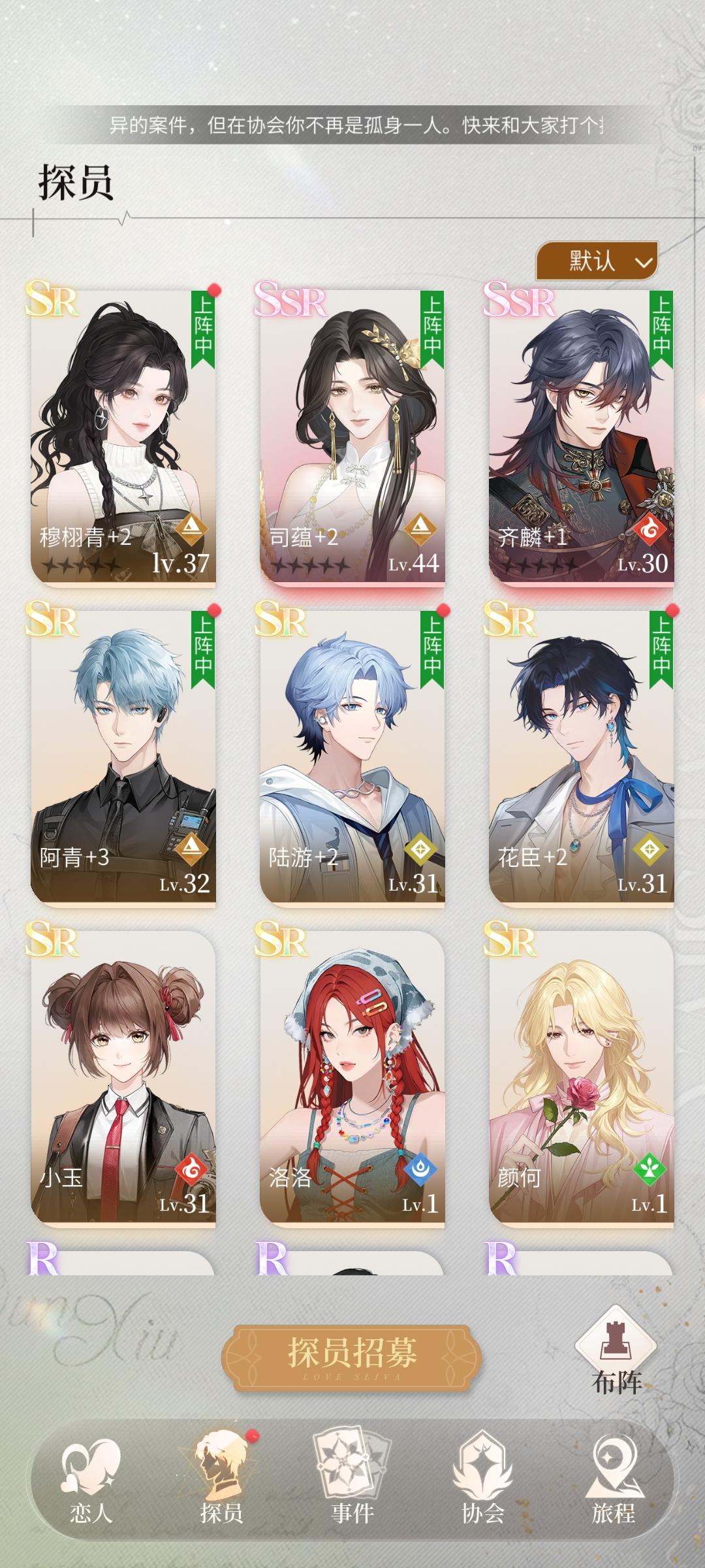 其实看pv是被阿九给吸引来的,本以为是个画风精美的游戏,结果界面居然想vx小程序,咱正式服开启后能不能搞搞你的主界面,别太廉价好不好。以下是内测的观感:剧情:我个人还是比较喜欢过剧情的,这个剧情只有6章而且每章剧情很少,大体的背景信息是搞懂了的,主要就是超自然事件,然后也算是比较吸引的吧,就是有时候咱能不能不加一些很潮的元素(你让让尘这么温婉的人说cosplay这词,ooc有点严重),后续希望
