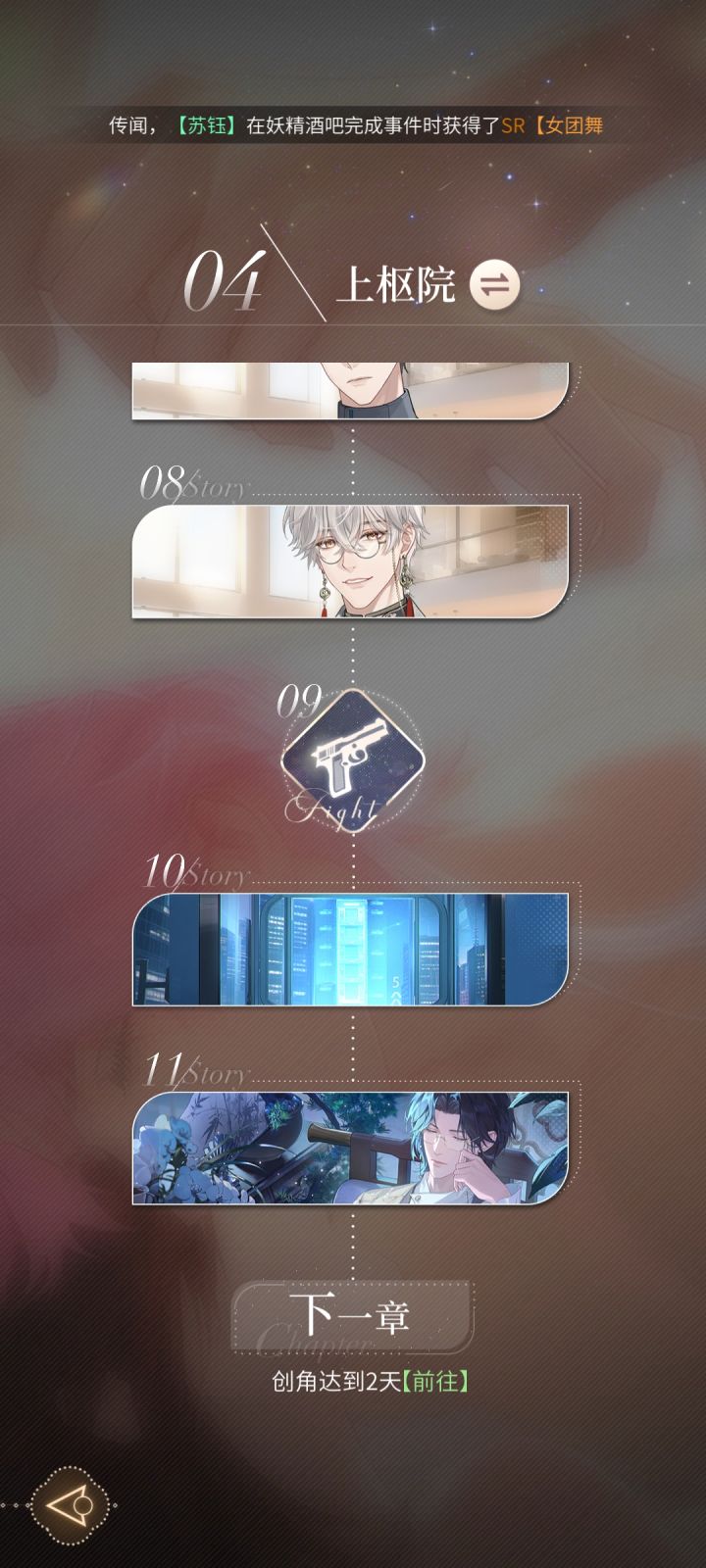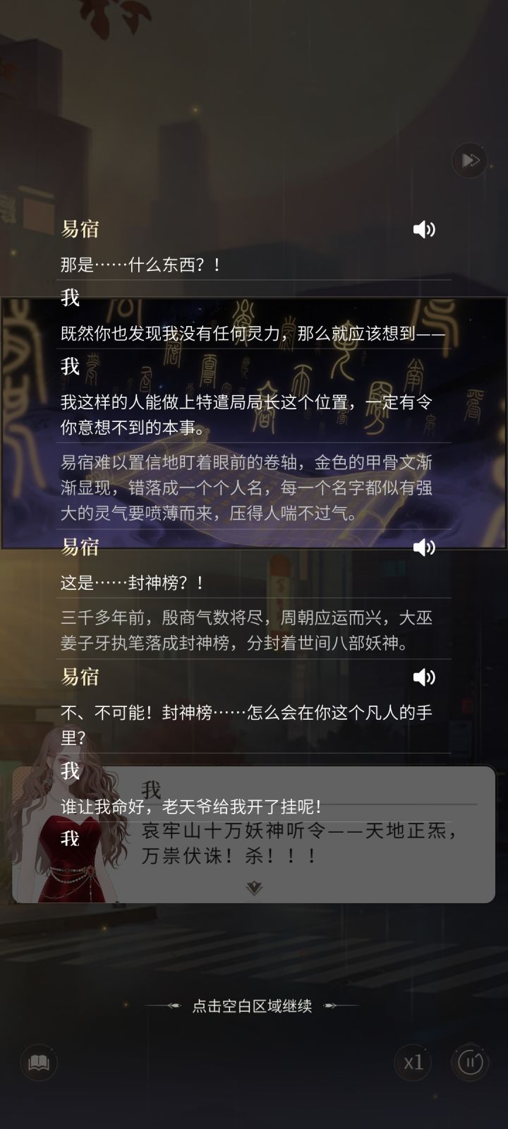 只截了剧情,还挺幽默的。主控因为被捡回来,一直和妈妈走对抗路母女的养成路线,所以是比较大大咧咧,身上带“挂”的设定。三位男主,一位是沉睡千年、在现代醒来的高冷妖怪,一位是魅惑人心、在现代当主播且会算命的狐狸,一位是表面上是上司、实则喜欢主控的温柔第一术士。至于玩法,是按时间恢复体力,用体力解决事件,从而拿到经验升级的流程。在解决事件中,会触发各种奖励,比如金币、钻石、衣服、升级材料或男主约会