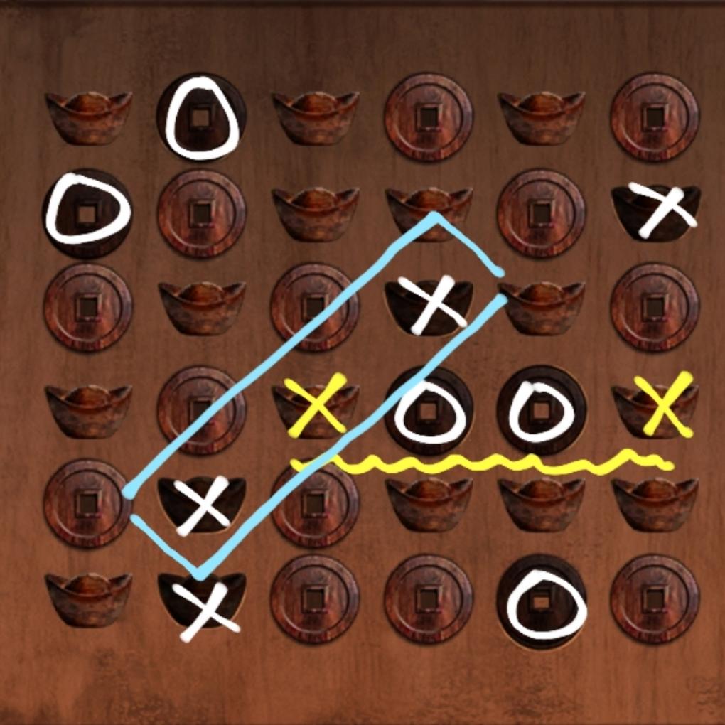 图一是通关答案,X是元宝,O是铜钱,试了至少十几种符合条件的可能,试到这里才通过,这里就是有bug,所以卡住了也不用纠结,只要符合条件,你就是对的图二,白色为原始固定棋子,通过第四行连续的两个铜钱,可以推出黄色,即左右两端必然是元宝,左侧元宝与原始固定的元宝必然会形成斜着的三连,所以就目前题目而言,必定不存在斜着不能三连的要求