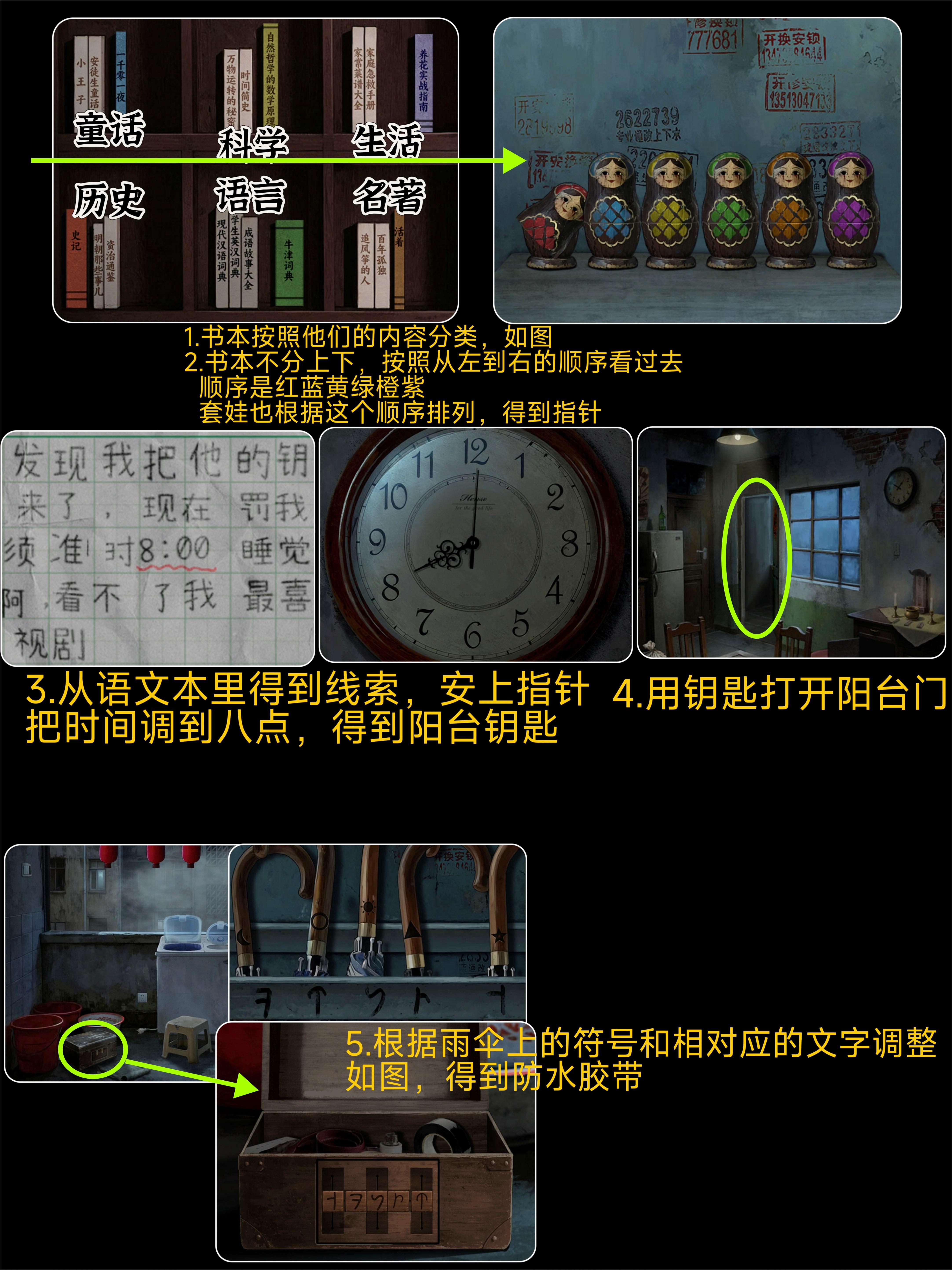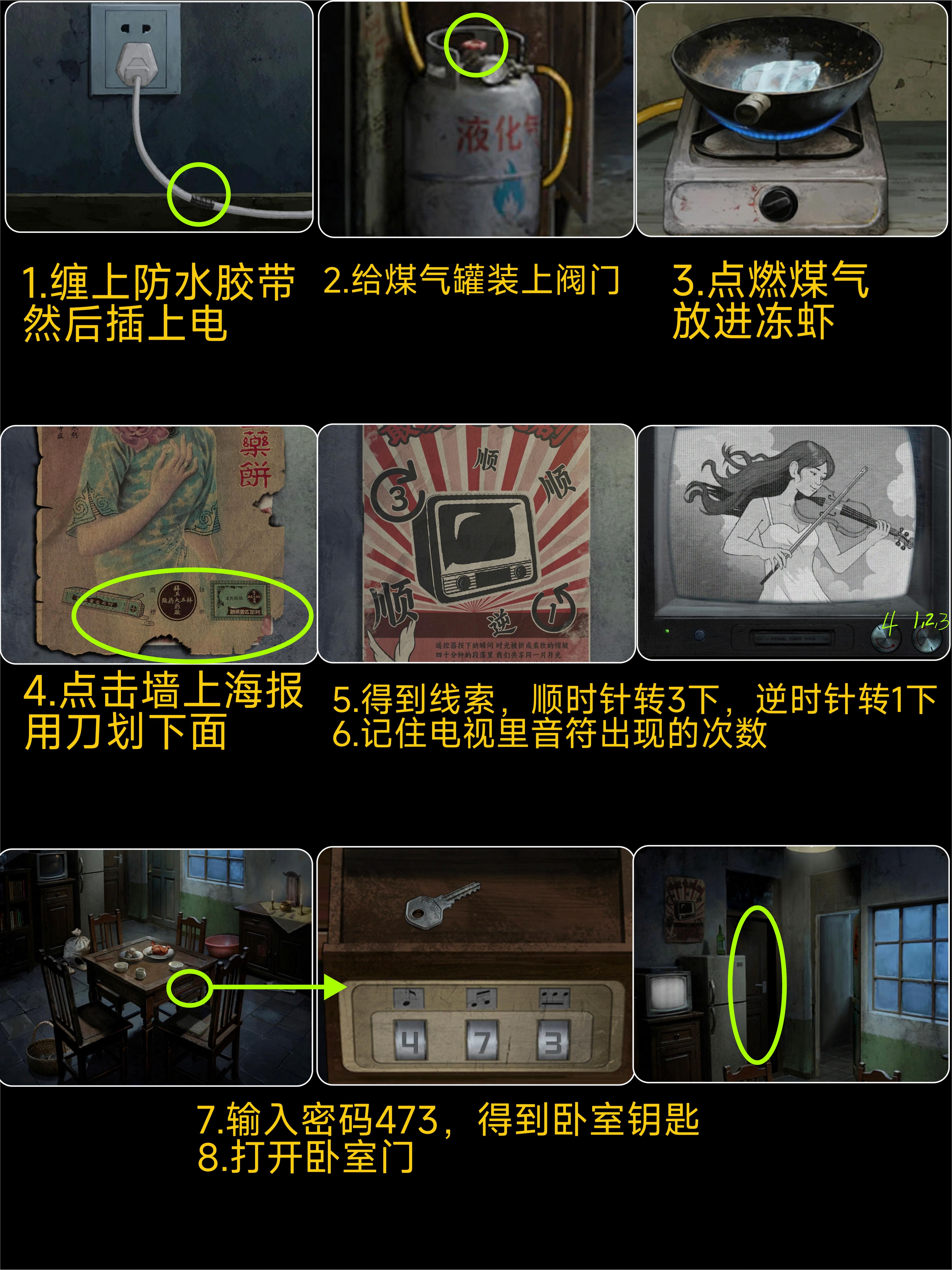 1.679解开旁边箱子的密码2.拆迁时间3.简单的数独4.电三轮旁边有本用紫灯照5.用香点画开祠堂6.恭喜顺时针,发财逆时针7.紫灯照狮子眼球8.收音机去旁边窗户拿手电筒照41239.真的难转得照每个圈的中心才能转