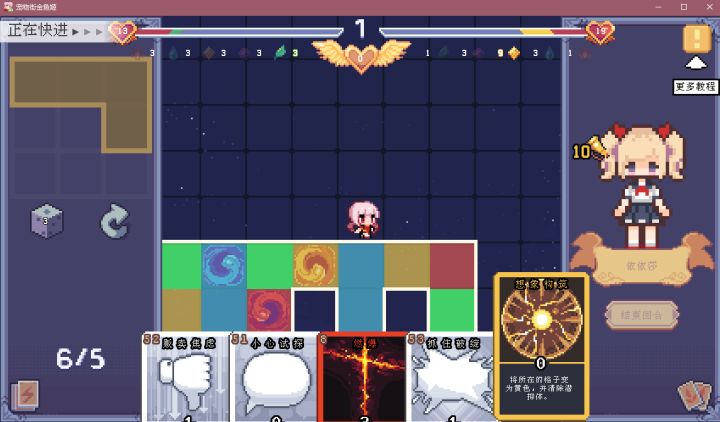 核心战斗部分学习成本略高,规则设计复杂,类似DBG卡牌的玩法,融入了俄罗斯方块的消除机制,每个回合的能量有限,出牌和消除方块都会消耗能量,有分配策略。界面右上角有详细的教学,玩不懂可以多看看,体验摸索下大概能玩明白,只看介绍理解成本比较高。