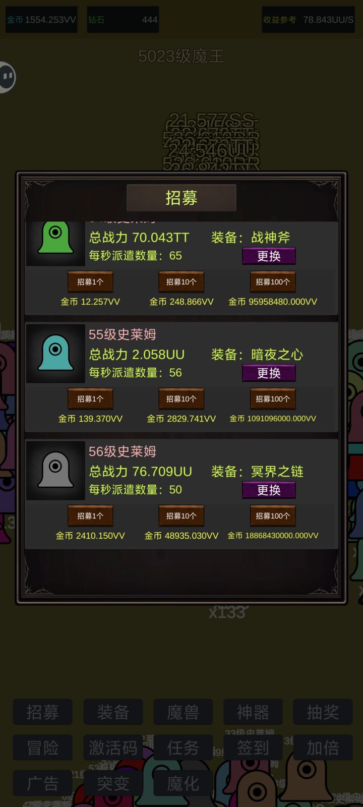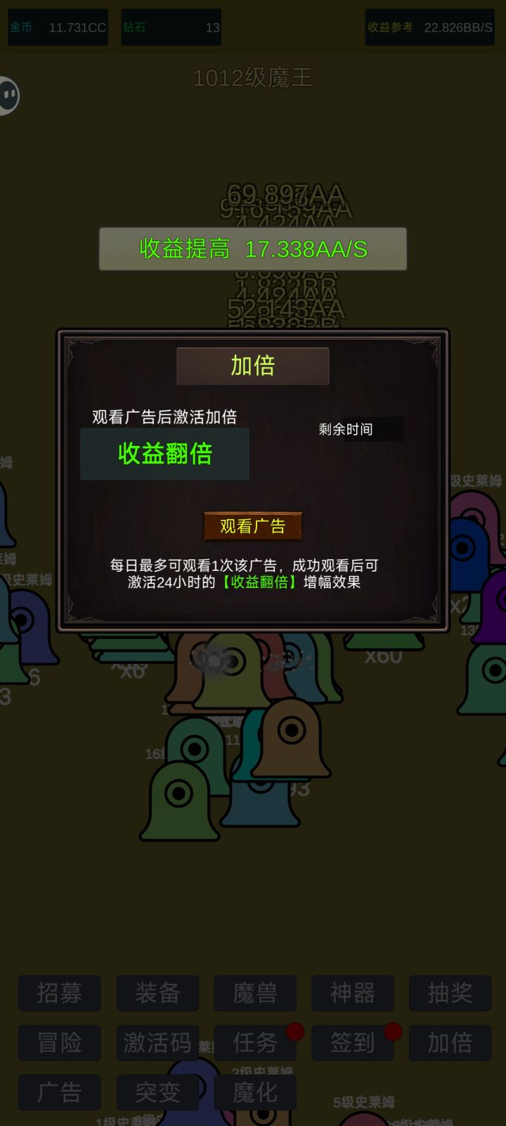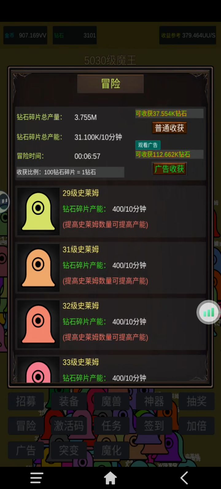 云手机24小时挂机的,简单说一下攻略先抽武器,抽取等级到3-4级然后随便抽几个魔兽和神器然后武器到7级,出了一个最后等级就可以了(给战力最高的史莱姆用)后面抽魔兽到7级,把所有魔兽都抽到。最后神器。来钻石最多的是冒险,我现在一天可以13万的钻石,所以低级的史莱姆要升个数。