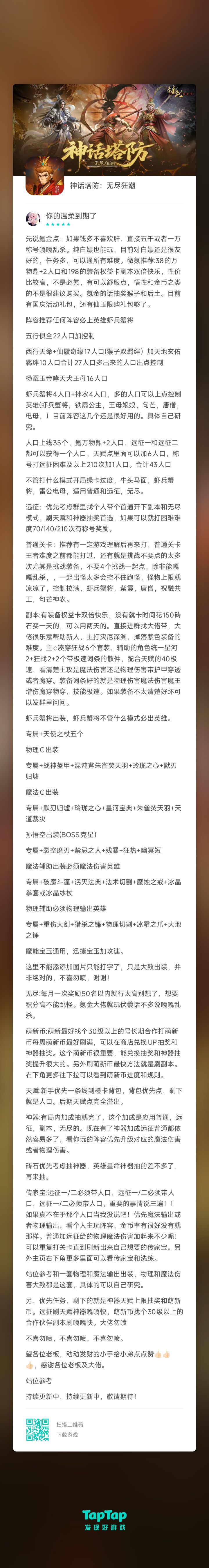 这游戏是养成游戏,氪了两个永久特权和通行证,加上日常签到,后土就抽满命星了。大部分资源靠肝和签到获得。资源篇提升战力的资源分这几方面,天赋,命星,装备,传家宝,称号和神器。天赋:首先,新手先肝天赋点,把加人口和加装备格子的点出来,有周上限是1750点(肝远征比较快,打不过进群抱大腿蹭车)命星:命星提升大,也最难获得,只能攒钻石抽奖,建议抽up池(后土,猴子目前两个是热门)装备:每天免费3