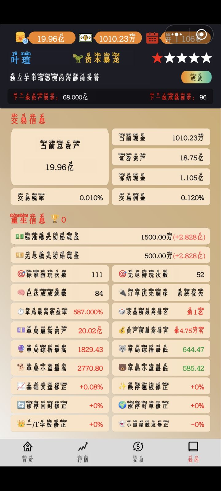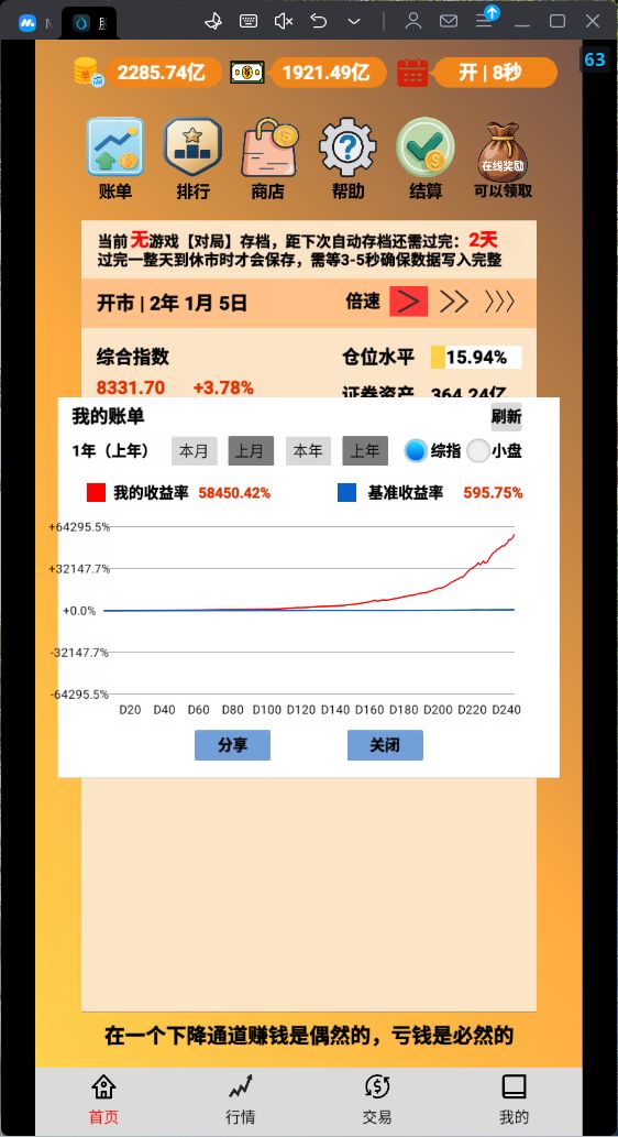 这个游戏玩了快两百个小时,玩了将近一个月才找到利用游戏机制快速复利的方法。前期积累钻石买资金礼包,初始资金到3亿后开始尝试坐庄拉抬,第一次坐庄毕业,纪念一下,爽!