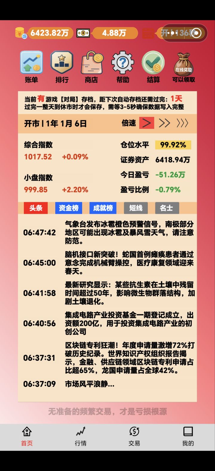 每次达成成就,清空资金概率50%。只要不完成成就,被清理的几率应该会很低。至少大盘,没到2888前,窝还是安全。也无所谓了。作者摆烂,凑合着玩。这游戏更新频率,还有bug,很难赚到什么钱。另外想赚钱,建议作者去看一下另外一款游戏。末日我有一辆房车。人家游戏没你的好,但是人家听劝,更新频率很快。该改的地方,当天就改了。更新啥,全让玩家投票决定。评论群热闹的很。建议作者可以去学