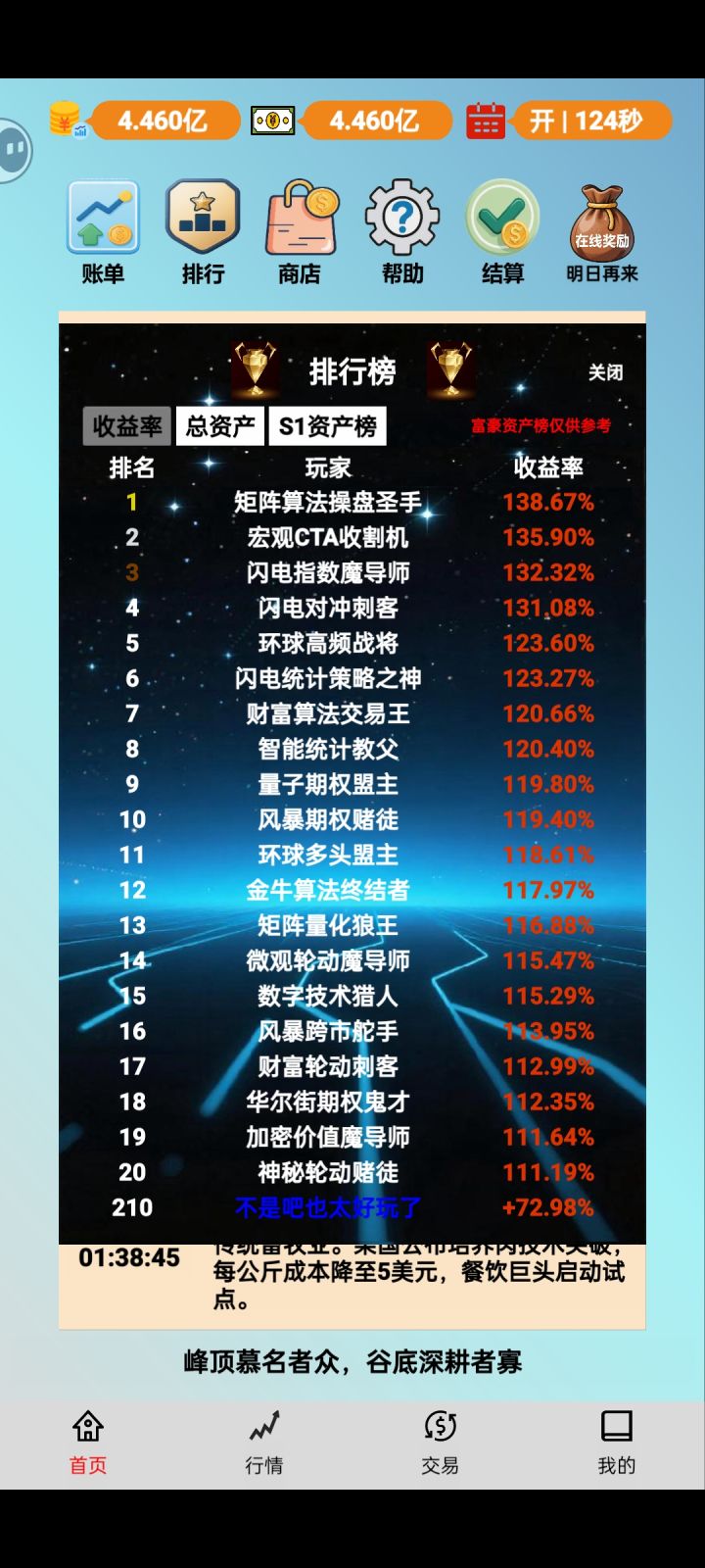 这个游戏玩了快两百个小时,玩了将近一个月才找到利用游戏机制快速复利的方法。前期积累钻石买资金礼包,初始资金到3亿后开始尝试坐庄拉抬,第一次坐庄毕业,纪念一下,爽!