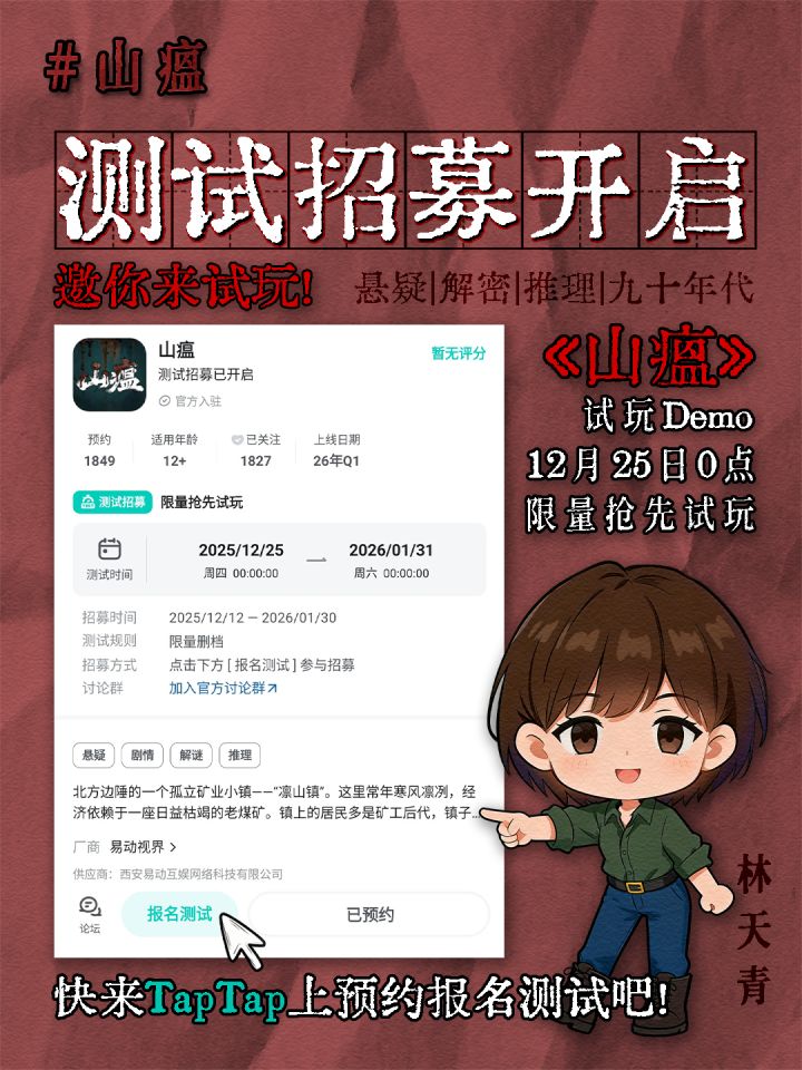 各位 TapTap 的解谜爱好者:大家好!中式民俗悬疑解谜游戏《山瘟》,即将开启限量内测试玩,现正式开启招募!游戏核心亮点听劝迭代的主角人设:根据玩家反馈优化的主角 “林天青”,凛山镇普通家庭出身,独立沉静的性格与复古穿搭,带你沉浸式代入时代语境;本土民俗悬疑解谜:以小镇民俗为基底,设计多维度解谜关卡,从场景线索到人物关系,每一处细节都藏着凛山镇的秘密;玩家共创机制:测试期间的所有反馈,