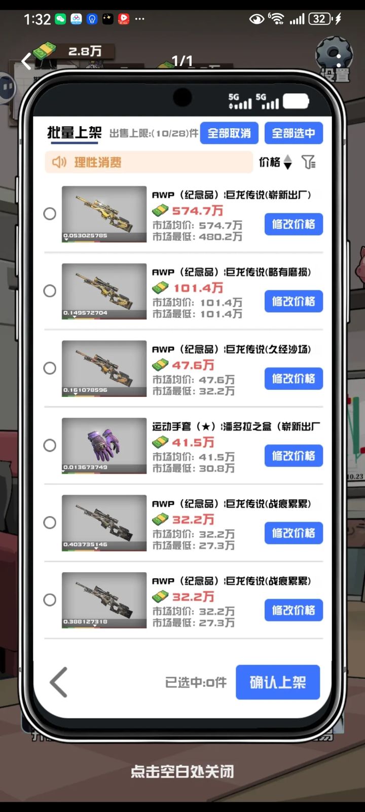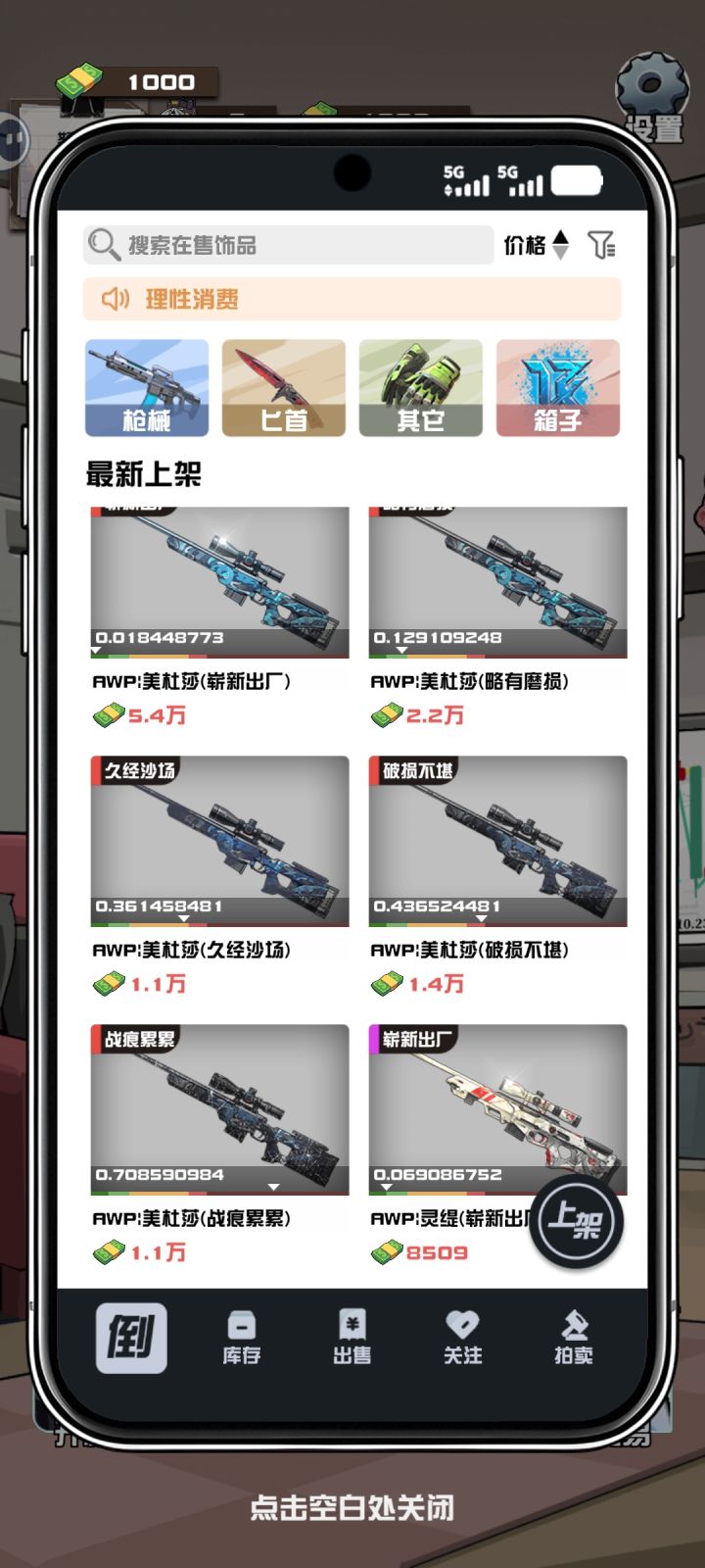 它完美复刻了CS饰品市场那种又爱又恨的感觉:开箱子时的心跳加速、出货时的狂喜、出垃圾时的血压飙升,还有把皮肤挂到市场上,看着数字一点点跳动的那种期待感,都被还原得淋漓尽致。每个皮肤的细节都做得很到位,磨损、磨损浮动、甚至不同的模板都有体现,看着自己仓库里的AWP巨龙传说、蝴蝶刀渐变之色,那种满足感真的太治愈了。