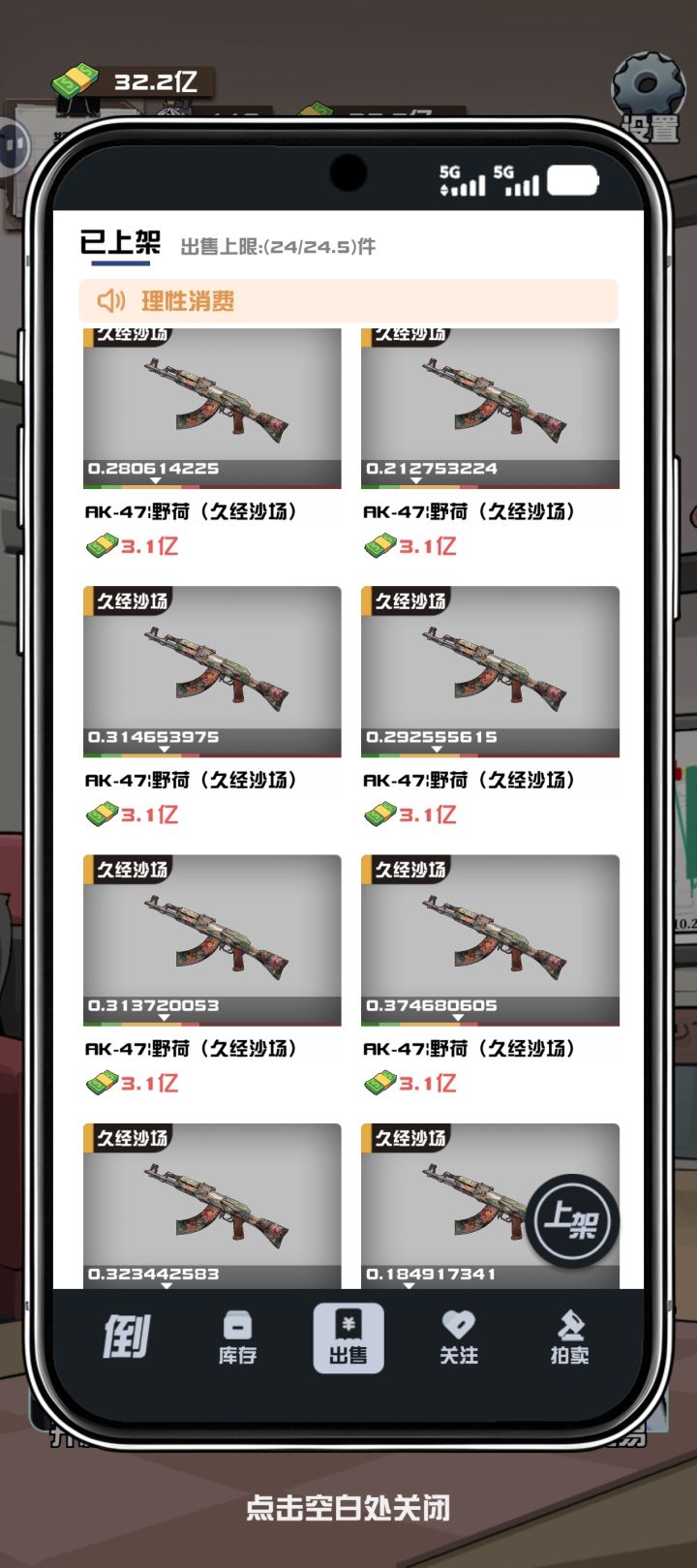 倒卖的核心就是赚差价,同类商品经常差价很高。前期进行原始积累,有一定资本(一百万以上)后开始屯货,推荐ak野荷、紫色手套、蝴蝶刀。把市场最高价点个关注,随便上架点其他东西赚钱,然后不停屯货。等到价格合适的时候卖掉,能赚上百倍差价,甚至不依赖行程能赚几亿,然后就开始养老坐等通关。