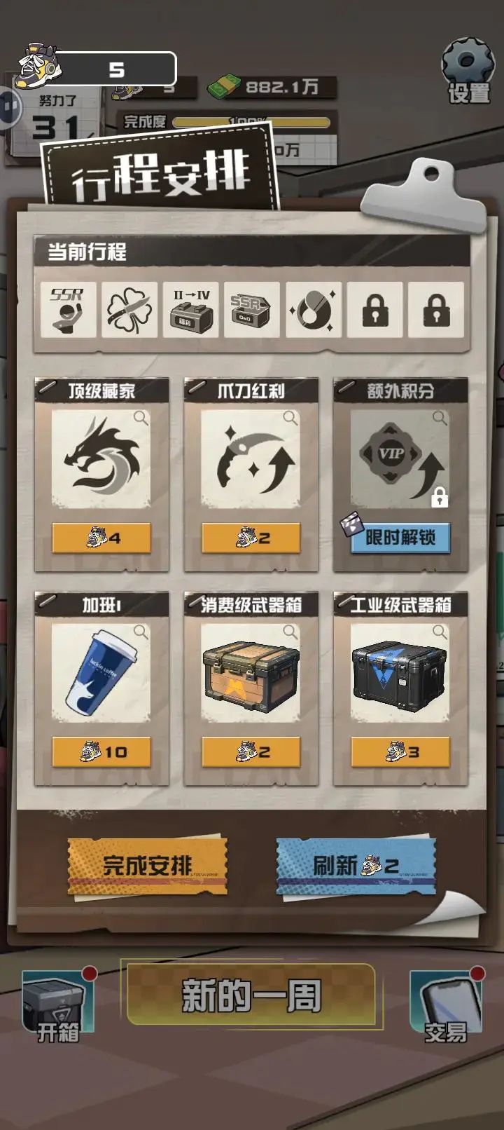 出个一键领取箱子吧,一个领取太累了,一万多积分,后面用都用不完,只管开箱子,开了就去买,有个天赋是卖掉商品得箱子的,箱子越来越多,实在开不动了,10万以下的都直接出售