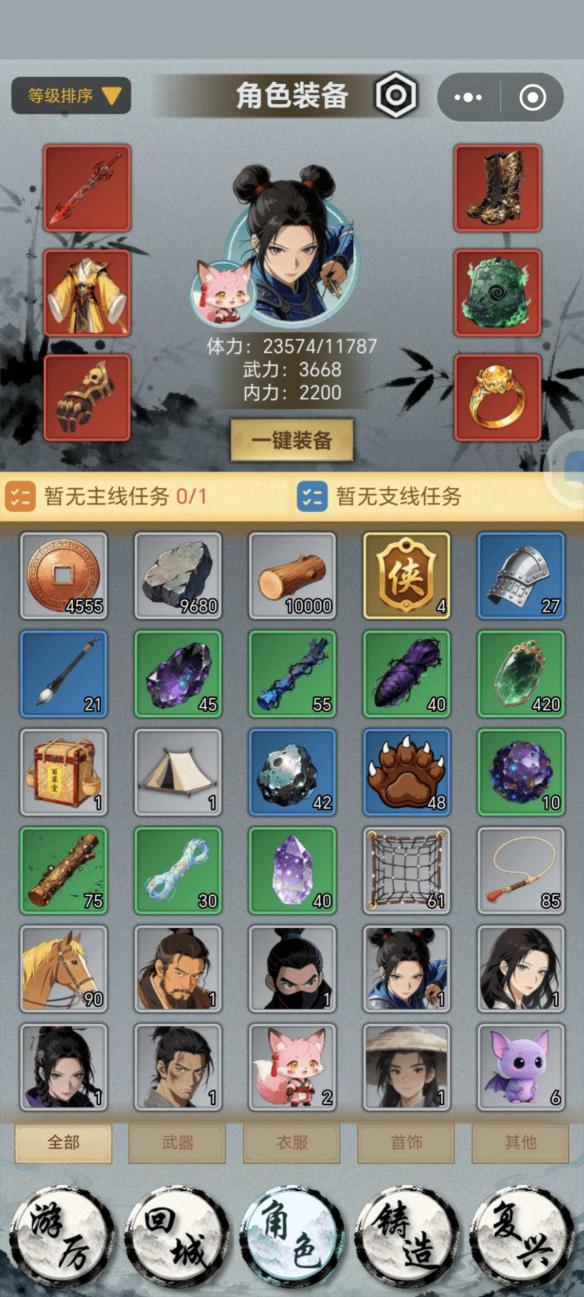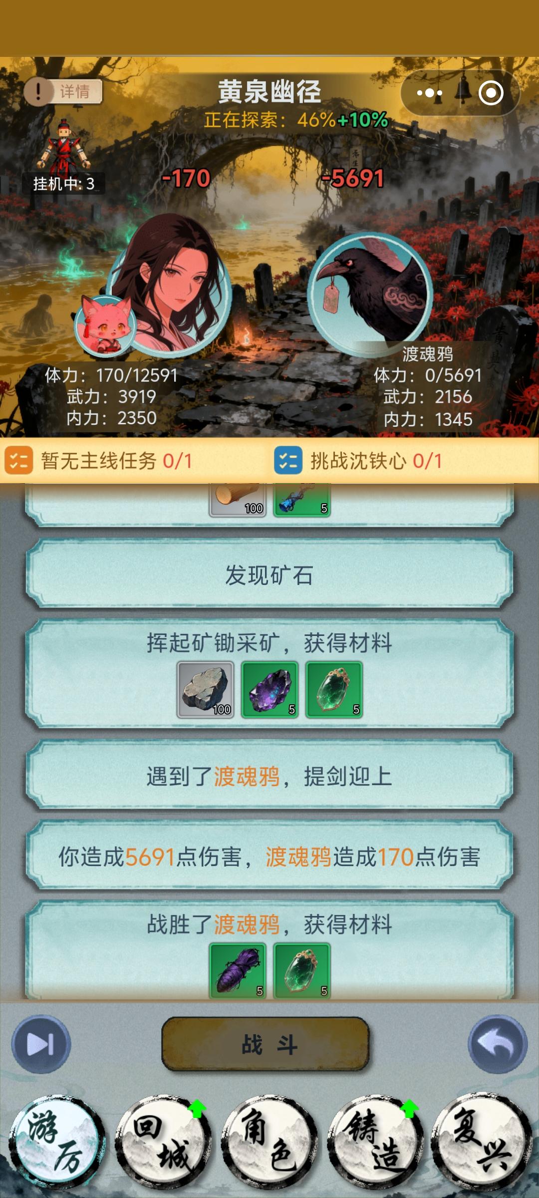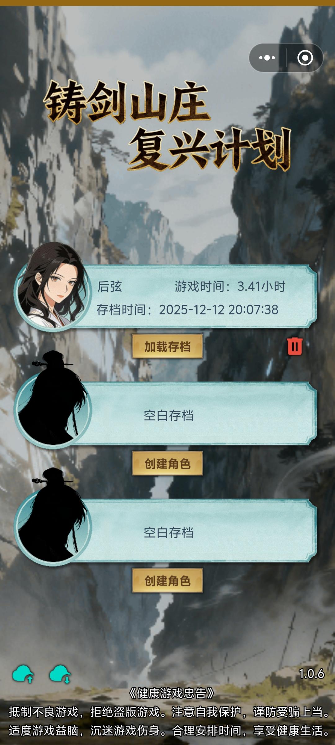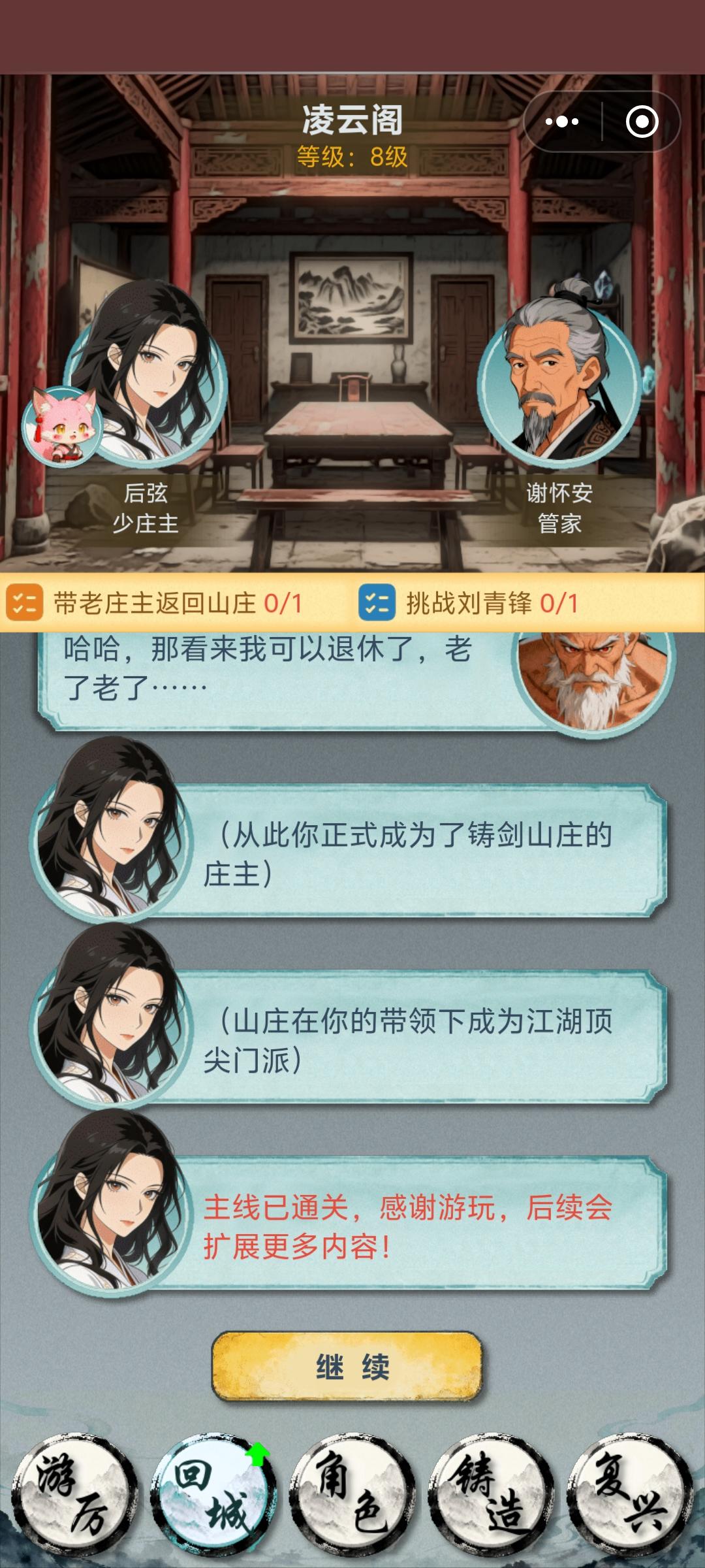 各位少庄主好,经历了长达两个月的开发,《铸剑山庄复兴计划》终于上线了。这是一款文字冒险+角色扮演的Tap小游戏,主要玩法就是游历获得材料,然后铸造装备,复兴山庄。游戏内有广告,但不影响主线体验,全程不看一个广告也能正常玩下去。闲话少说,接下来说几个攻略要点,可以让少庄主们少走弯路:1. 游戏初始跟着主线走即可,很快就能过。2. 每次升级换了新的白装以后,需要用精炼符继续提升装备品质,可以