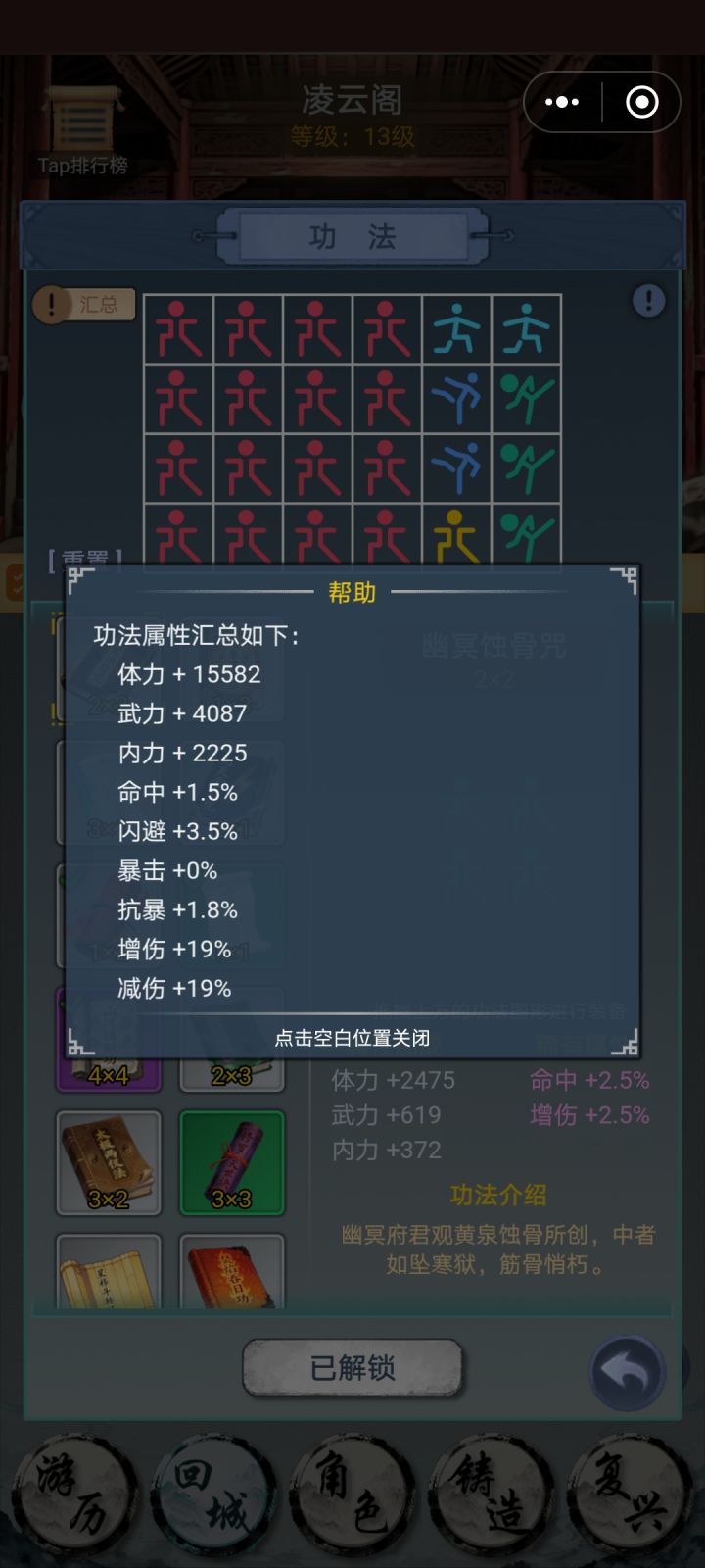 先说一下难度:这游戏遇到肝帝的话就一天可以全成就通关了……评价一星(总星五星)首先功法和神兵:不想等的话看广告直接拿(我是正常挂机,不然更快通关)功法搭配:看上图(增伤>闪避>其他)九霄搭配,看上图(可以刚好卡70上限)洗练搭配:建议全攻击,后期防御血量没什么用宝石搭配:四个闪避共鸣两个命中共鸣(这样刚好平衡宝石的数量,可以省九霄点数)开局:去搜一下兑换码再开始过本每个关卡先买一堆强