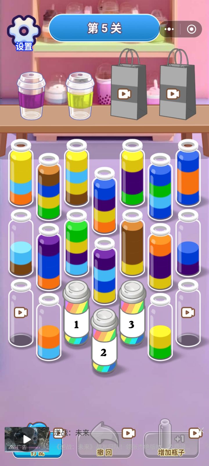 游戏的玩法和特色就这么多,剩下的就是游戏中会带有一些广告,有些广告还带有一些引导的倾向,不点广告也行,在初期是没问题的,但到了后面就是试管开始多了,广告就会遮住一部分试管。