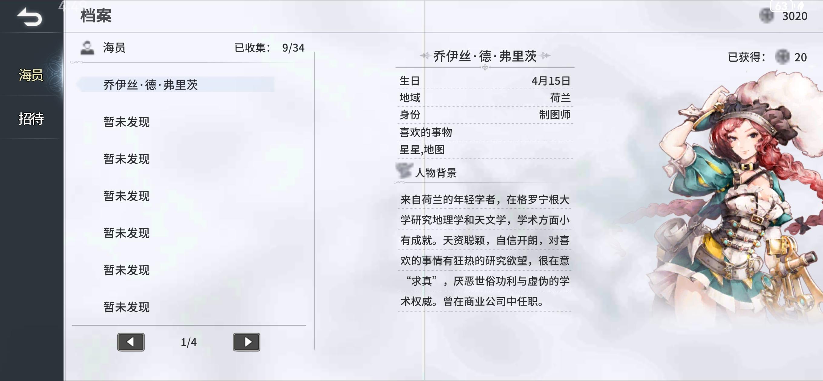 四主角四个主角完成主线剧情后会得到信物,可以在之后周目招募成为船员欧洲制图师 乔伊丝·德·弗里茨 安德鲁开局初始船员 非初始应该是在阿姆斯特丹触发翻译家 威廉·安斯艾尔 安德鲁开局初始船员 非初始应该是在伦敦触发骑士 安德里亚斯·海因里希 比萨触发后那不勒斯内陆探索继续剧情商人 穆斯塔法·埃米尔 土耳其西部内陆探索触发大副 马尔缇姆·阿尔梅达·布兰卡 里斯本还是波尔图触发手工艺者