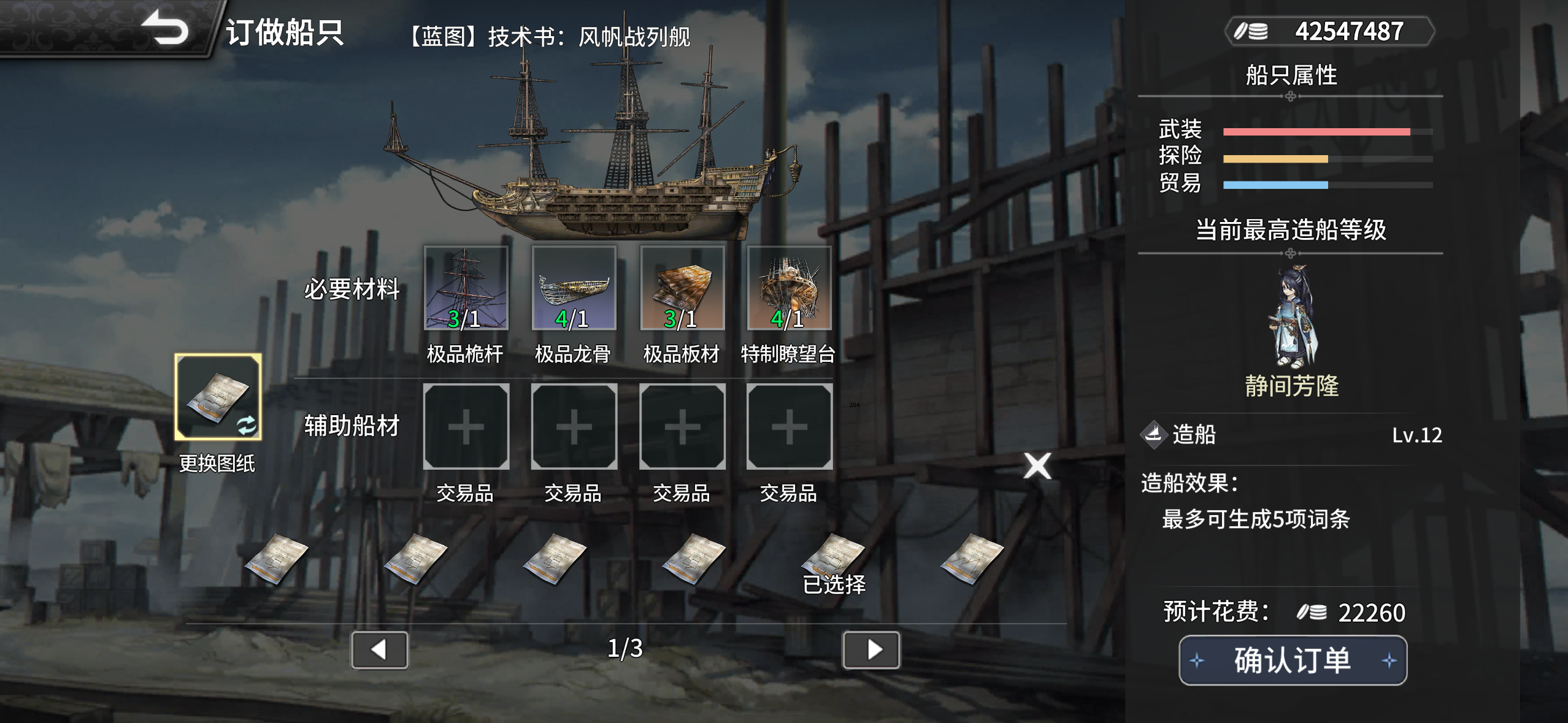 暂时可以横着走一段时间了一个通宵亲测,任何港口三维拉满都有几率出任何船。为了节省跑路时间,我都是就地取材就地造船,感觉“没有特定港口几率就大”的说法(就出与不出,50%的概率吧)。两艘圣三一出自加勒比,两艘出自印度洋周边,一艘卡蒂萨克出自塞维,两艘出自东南亚和东亚。给我的感觉就是反正哪哪都有几率出任何船,至于要出自己指定想要的那艘,就只能等时间到收船时看