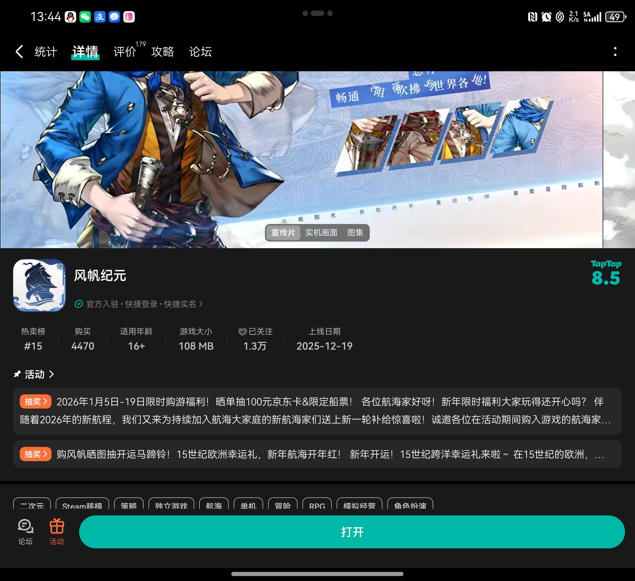 各位航海家好呀!新年限时福利大家玩得还开心吗?伴随着2026年的新航程,我们又来为持续加入航海大家庭的新航海家们送上新一轮补给惊喜啦!诚邀各位在活动期间购入游戏的航海家,晒出你的“船票”,即有机会将丰厚好礼带回家!活动时间:1月5日起至1月19日17:00奖励:100元京东卡(5名)、限定实体纪念船票(5名)参与方式:活动期间内在TapTap购买并下载游戏,在本活动帖评论区带上您的购买成功