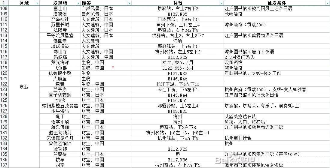 ……【东亚·区域攻略】:(1)【东亚·港口及坐标点】:[漳州]:E118,N25[杭州]:E121,N30[海州]:E119,N35[澳门]:E113,N22[淡水]:E121,N25[安平]:E120,N23[汉阳]:E126,N38[釜山]:E129,N35[浦项]:E129,N36[长崎]:E130,N33[江户]:E136,N35[堺]:E140,N36……