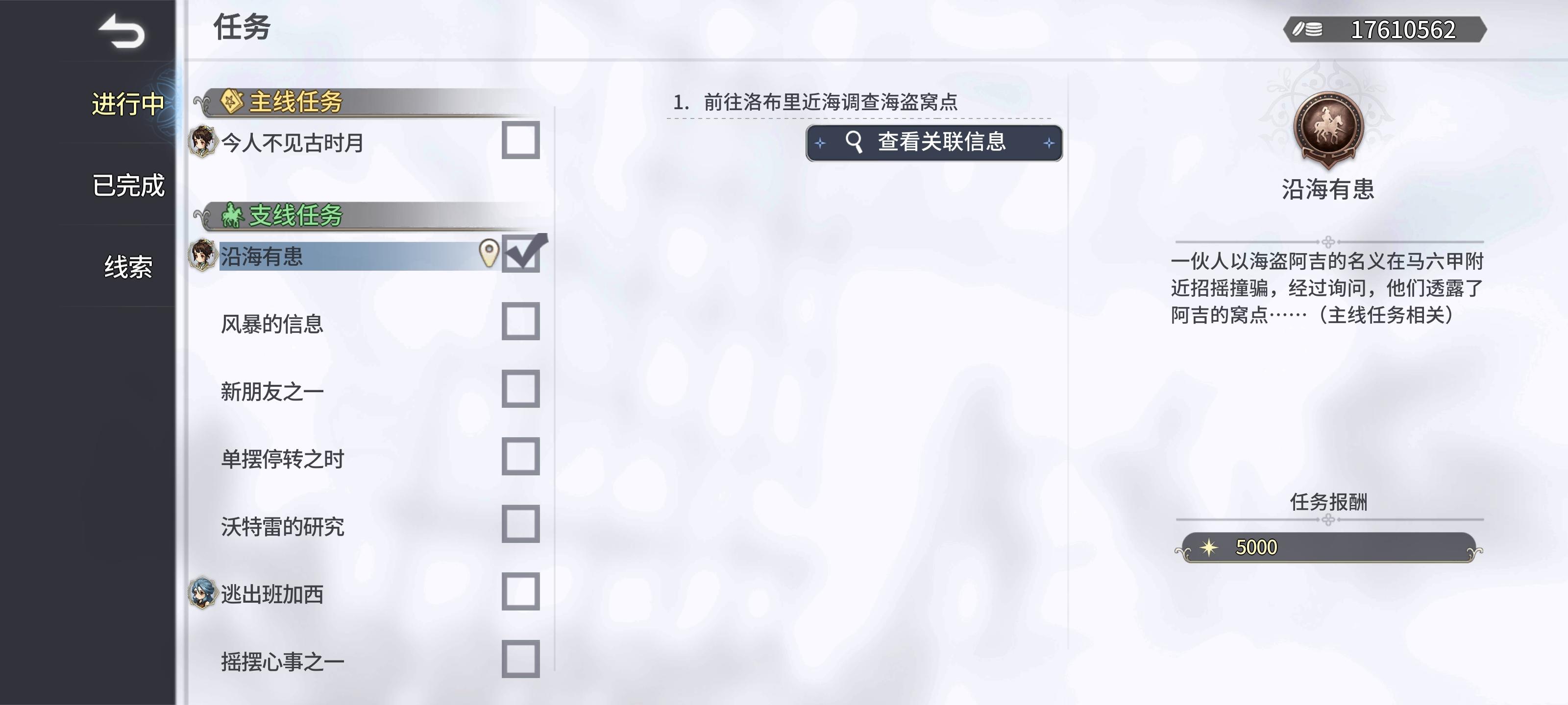 我想请问一下各位大佬,我那个主线任务去马六甲寻找彻底击败海盗阿吉的方法,我去了那个马六甲,没有任何感叹号提示啊,还有第二个问题啊,就是我中间那个图沿海有患这个任务,我跑遍了东南亚,亚洲甚至印度洋的所有港口,都没有任何感叹号,第三个就是那个加拉瓦姐弟相逢任务,正如我第一个图,我和他姐姐的好感度已经满级,并且大他也在我的船上,可就是没有触发这个任务,我这个到底是游戏的bug还是我方法没对?