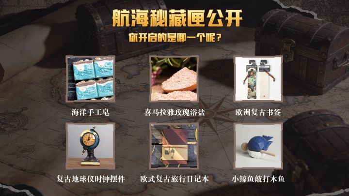 各位航海家,欢迎登船!每一次出航都是一场冒险,而冒险的意义,正藏于那未被照亮的海域与未被人知的机遇之中。海浪之下,海岸之间,无数沉睡的秘密正等待被唤醒——作为航海家,你们的使命便是探寻那些未被标记的角落,打捞起时光掩埋的馈赠。为此,我们踏遍七海,将散落的奇珍与心意汇集,封存于6只神秘的“航海秘藏匣”中。现在,将这份惊喜交予命运的海流与你的直觉——选择你心仪的数字,就像在星辰中选择航向。未知,
