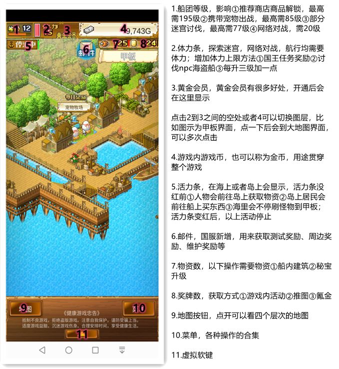 一.游戏界面详解主界面详解点击右下角菜单按钮后界面如下所示详解上图4战斗队员详解上图5同伴名单详解上图10建筑详解上图12道具二.如何快速开局而不卡关1.开局职业建议选战士或者狙击手2.按照简短的教程操作之后去酒馆招两个厨师(后面奖牌足够的情况下回来招全6个厨师),主角做队长组成三人队伍后开始探索迷宫,直到得到船3.得到船后按顺序探索(探索过程中看见的人物除渔夫和船夫外都不用收