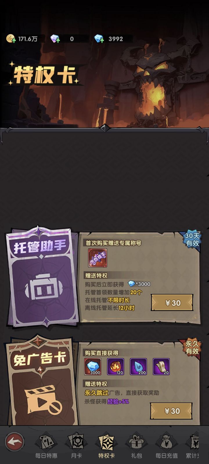 4、其他的话就是免广告卡和托管,等于帮你释放双手,真的是挂机打一切了
