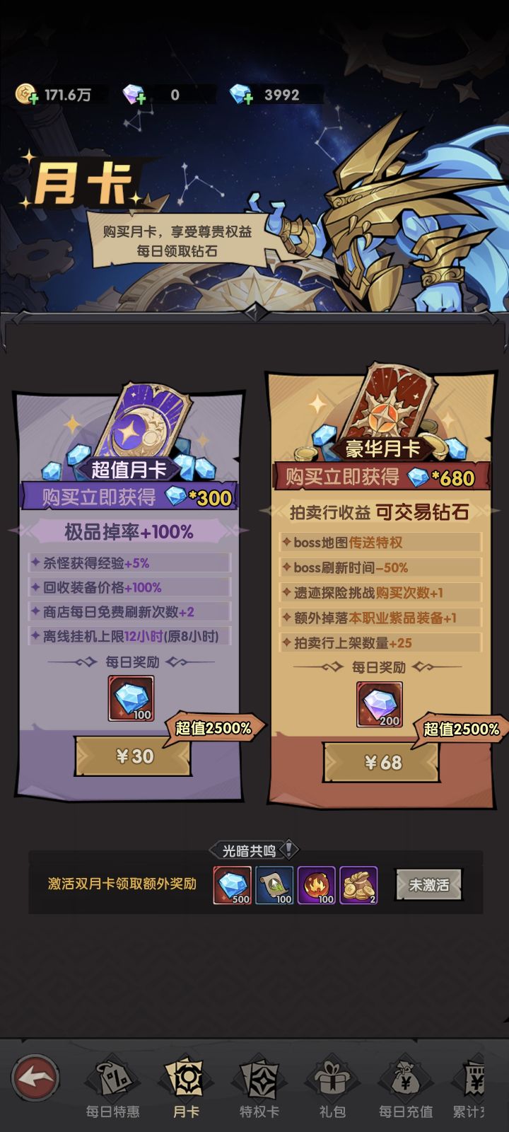 3、有条件的画还是推荐大家买豪华月卡,拍卖行的钻石变成可交易的很爽,如果你够欧的话,可以卖出去赚很多钻石,这些都是等于充值的货币来的,甚至可以养小号买你大号上架的装备,直接自给自足