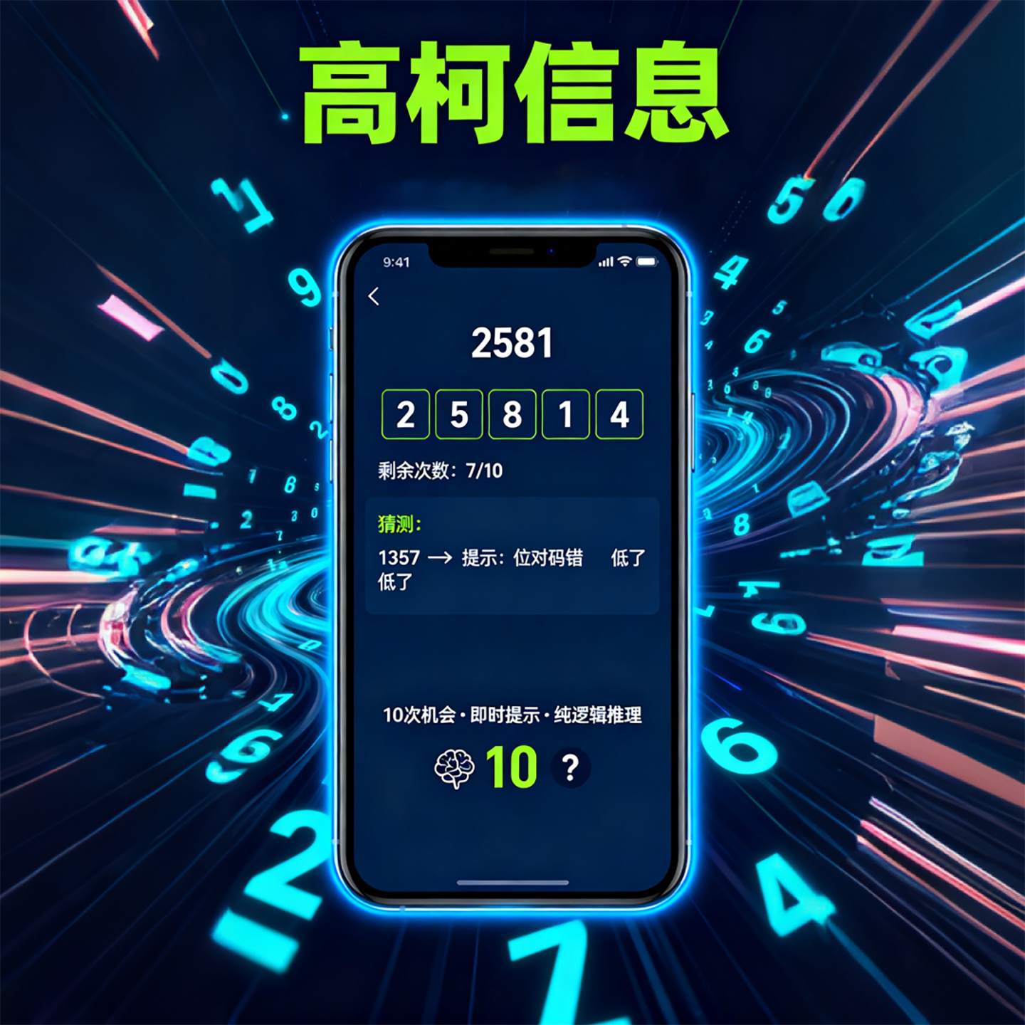 玩家需要在 10 次机会内猜中系统生成的 4 位随机数字密码(0-9,允许重复),每次猜测后会获得 3 类提示: 高了:猜测的 4 位数字整体大于密码 低了:猜测的 4 位数字整体小于密码 位对码错:存在数字与密码一致但位置错误的情况(数量不明确)