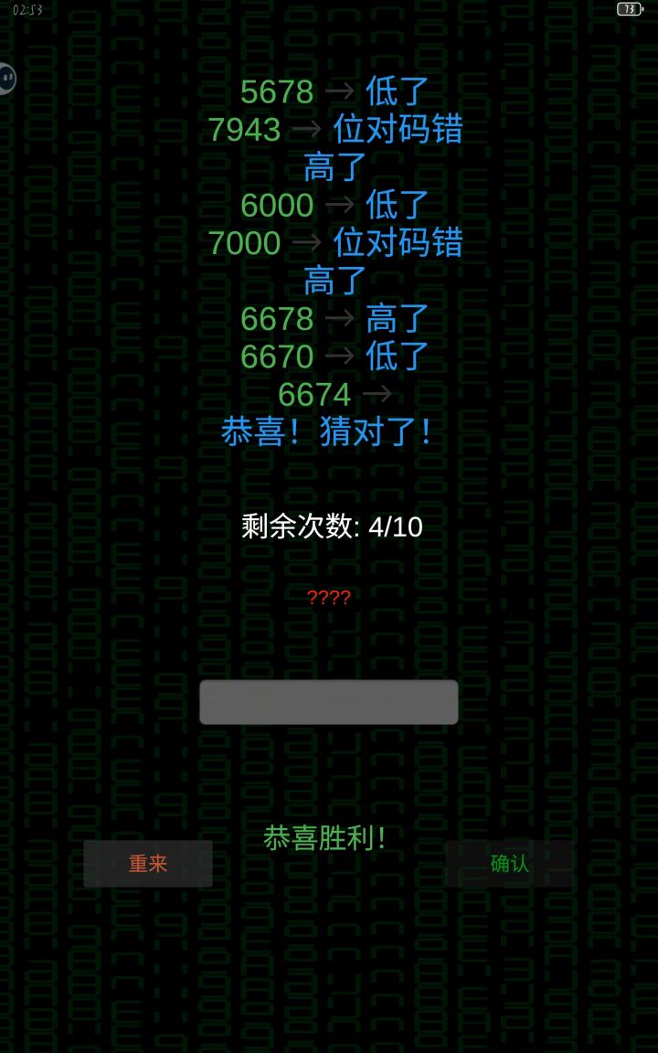 ps:每个数位上的数字可重复,但结果是各自独立的。(举个例子,正确答案是6864,我写6000会出现结果b,我写7961也会出现结果b,这就得看玩家心中有没有正确答案中有重复数字的这根弦。)