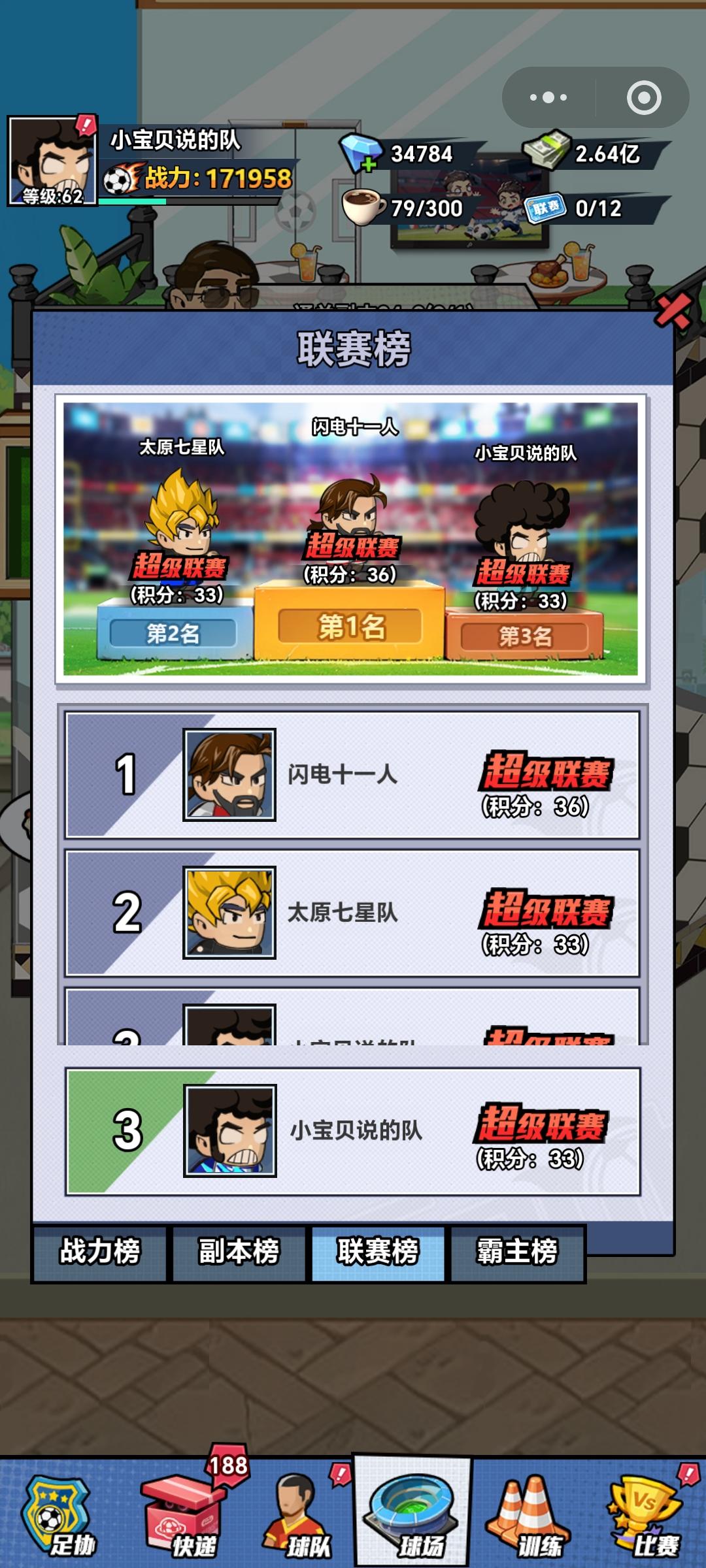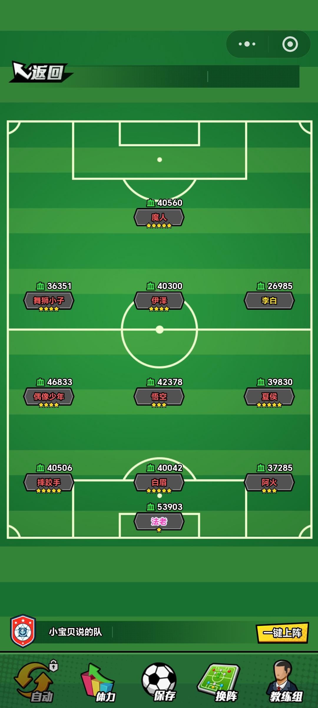 如图,单五星魔人,3331阵,早上刚打进世界杯,17万战力,和快20万的大佬坐一桌,大佬五星吉吉,我就一个彩法老,后卫后腰也不是都高星极品巨星,就一个四星鸡哥一个三星鸣人,前腰是个黄李白只要后场顶得住,基本输不了,最差就是个一比一平,运气好魔人两个大全进就稳了李白很重要,黄色也上,走边路带11号球衣基本不会被铲翻,反正我是没翻过之前的四星多多四星姆总3232,甲级联赛都踢不过,只要没有单刀,