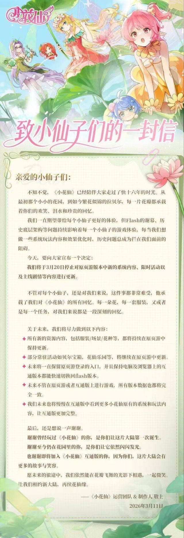 又有大的啦家人们!由上海淘米网络科技有限公司研发运营了快16年的的少女类角色扮演网页游戏《小花仙》近日宣布将于3月20日停止原页游版本中新的系统内容、限时活动及主线剧情更新,这一下子可把玩家们给整不会了,引发了热议!官方解释,停更原因和Flash谢幕、游戏历史底层架构等问题有关。不过虽然新内容停了,但服装、场景等资源更新会继续,常驻活动如贝尔宝箱保留,原页游入口也一直能用,互通版数据同步。讲