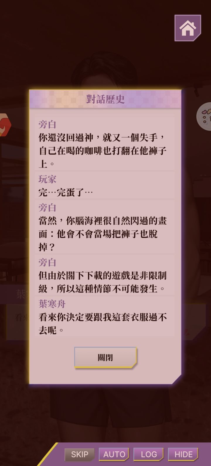 当时玩到这三章剧情的时候,笑死我了,主控很神奇的把咖啡泼到了人家的身上,然后人家把上衣脱了,于是又一不小心泼到了人家的裤子上,旁白来了一句,因为这是非限制性游戏所以不能出现这个画面