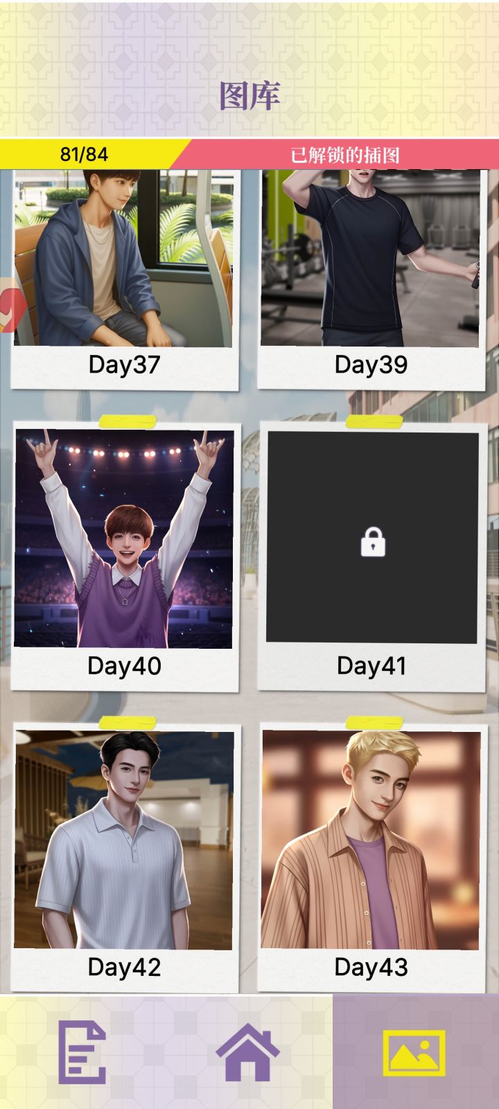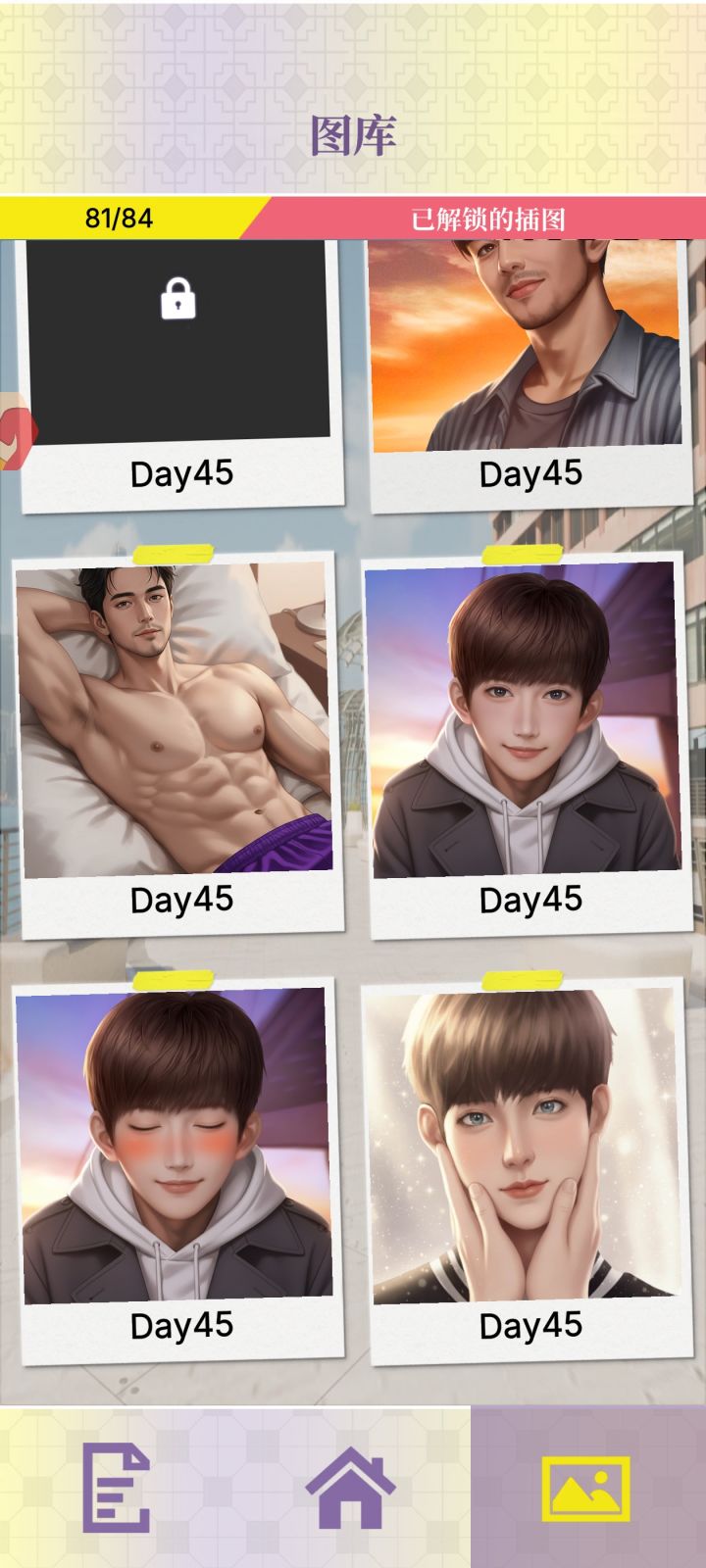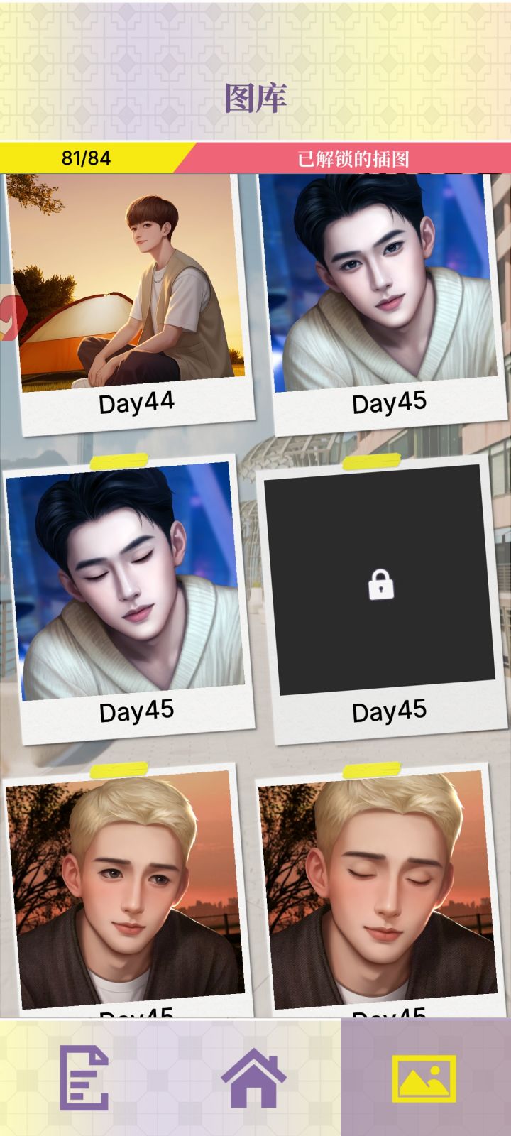 41三人行那一章缺一张图片,45结局差两张图片比较喜欢林书然弟弟和何瑾言,那个中央空调王景澄不喜欢,最后王的结局he完了我还重新刷了一遍拒绝王的结局,要不是为了凑结局我都不想刷他好感