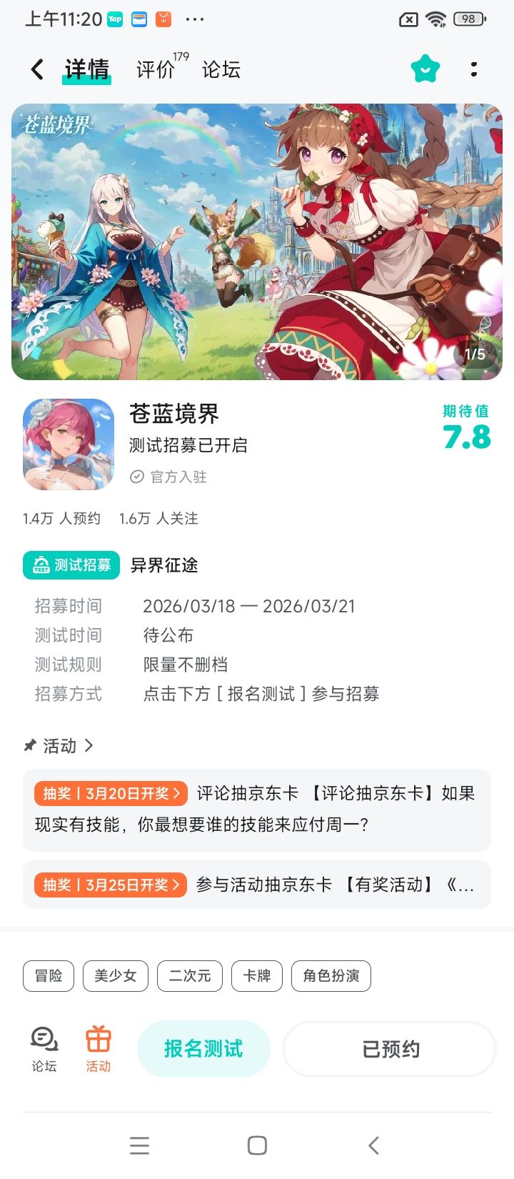 你的世界,从此分裂二次元动漫RPG手游《苍蓝境界》是一款综合了角色收集养成、横版即时战斗、多人合作挑战等玩法的二次元角色扮演类手游。点击立即报名测试:【参与方式】1.关注《苍蓝境界》且发新帖晒截图2.在本帖下方评论区分享发帖链接即可【活动时间】即日起~2026年3月25日 23:59【活动奖励】京东卡,共5份【注意事项】1.仅有符合活动要求的评论会被视为有效参与活动,若回复内