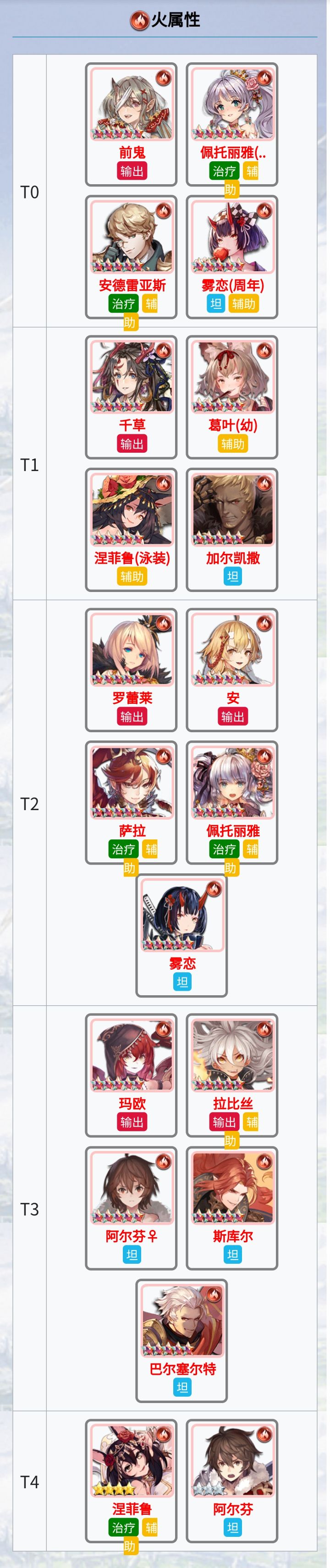 四个T0直接一队就是每个属性的最强阵容,如果要是搞不到T0的输出就用T1的输出,默认技能星盘魂灵拉满戴上合适的灵装,星盘魂灵不拉满可能会很菜。提到的三星四星只能过渡用没提到的也完全不需要。【萌新配队】火队篇(星盘+灵装+魂灵)https://www.taptap.cn/moment/535063239994640027【灵装推荐】能用到后期的装备和获得方式https://www.tapt