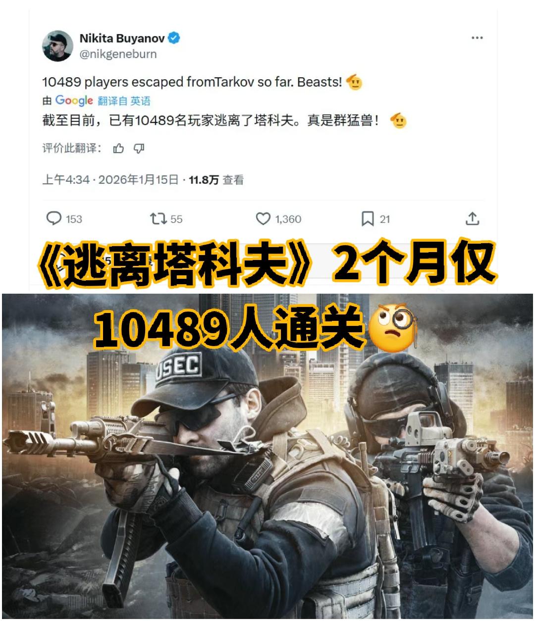 《逃离塔科夫》制作人尼基塔·布亚诺夫(Nikita Buyanov)于今日2026年1月15日透露,游戏在1.0版本发布后两个月内仅有10489名玩家完成通关。这款游戏以超高难度著称,首位玩家曾花费两周时间才达成通关成就。目前游戏周活跃玩家约4.5万(PVP)和3-4万(PVE),通关率仅占10%左右。#主机单机 #逃离塔科夫 #游戏资讯 #