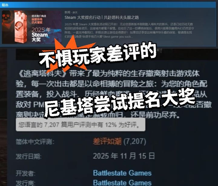 差评一堆还想提名steam大奖,尼基塔你的美梦该醒了。#主机单机 #游戏资讯 #逃离塔科夫