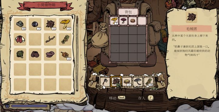 身处严冬,小老鼠每次外出都必须注意保暖,游戏分为白天与夜晚两个阶段,偶尔还会出现极端天气暴风雪。在夜晚或大雪天气中,小老鼠的体温急速下降,需要依靠篝火或吃食物恢复体温,高品质的衣服也能增强一定抗寒值,但终究不是权宜之策。在我实际体验中,每到夜晚通常都会选择回家睡觉,一方面是在家中我们能为下次外出做一些准备以及规划,另一方面是小老鼠的背包空间十分有限,即便在剧情后解锁更多空间,对于我这种喜欢什么都想拿的玩家来说也是不够用的,需要时刻要回家存放,不过游戏的储存箱又是令我难受的一点,其主要原因是物品不会自动堆叠以及没有一键整理(至少我没发现),虽然储存箱里的东西可以随时使用,但当我们要找某些物品时会发现比较混乱,而且游戏的键鼠适配在部分情况下并没有那么舒适。