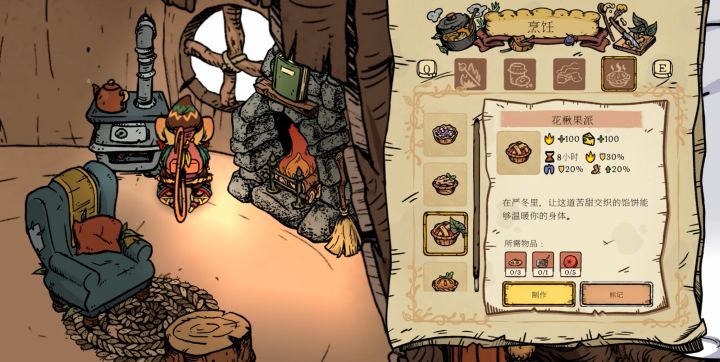 游戏内食物除了提供饱腹外,还能带来各种增益效果,例如上述提到的恢复部分体温、增强体力或提升攻击力等,这里非常推荐大家在有足够材料后做各种派和炖菜吃,虽然只能提供一时的饱腹度,但像蓝莓派这种会提供80%的移速加成,能让玩家探索跑图非常舒服,体验健步如飞的感觉。