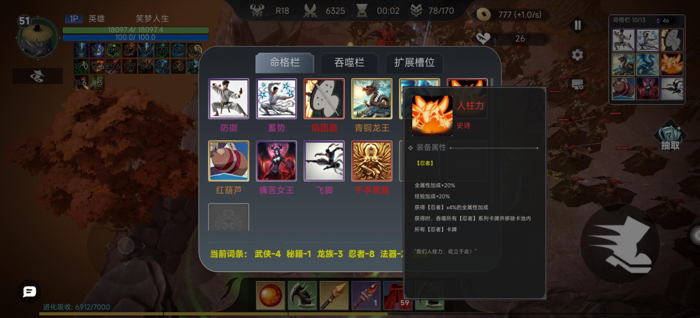 新手玩家天赋树先点通用到+100魂玉,开局一定要优先选择全属性+0.1的牌。除了三张全属性0.1的卡牌以外,个人喜欢防御龙+攻击龙+精神龙+武侠蓄势(重复购买不占命格)+求道玉(可以吞噬所有法器牌)七子神通+二郎神....