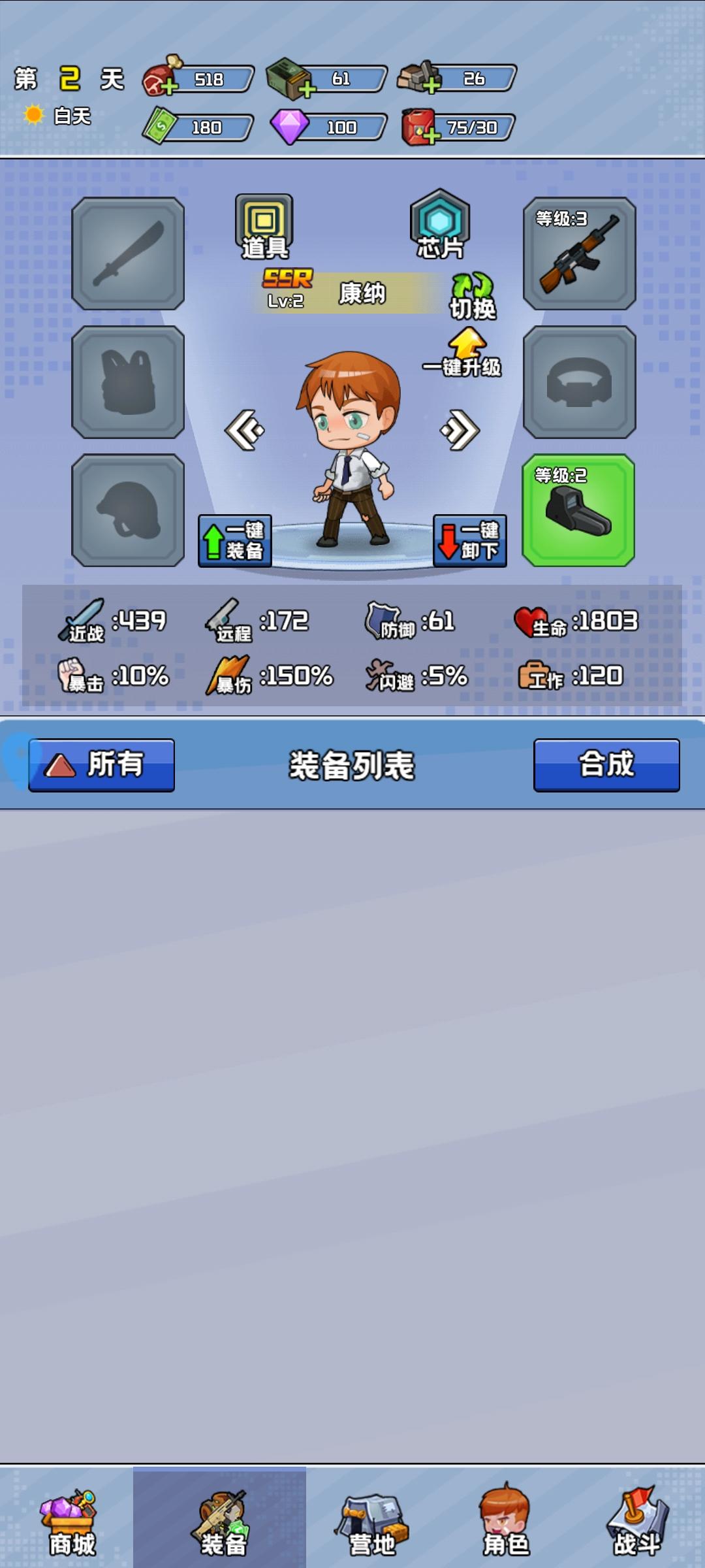装备槽位六个,有品级设定,强化针对单件装备,更新装备还需要再强化。支持一键穿装和脱装,也可以一键强化,操作易用性很好。同界面还有道具和芯片养成,解锁较慢。