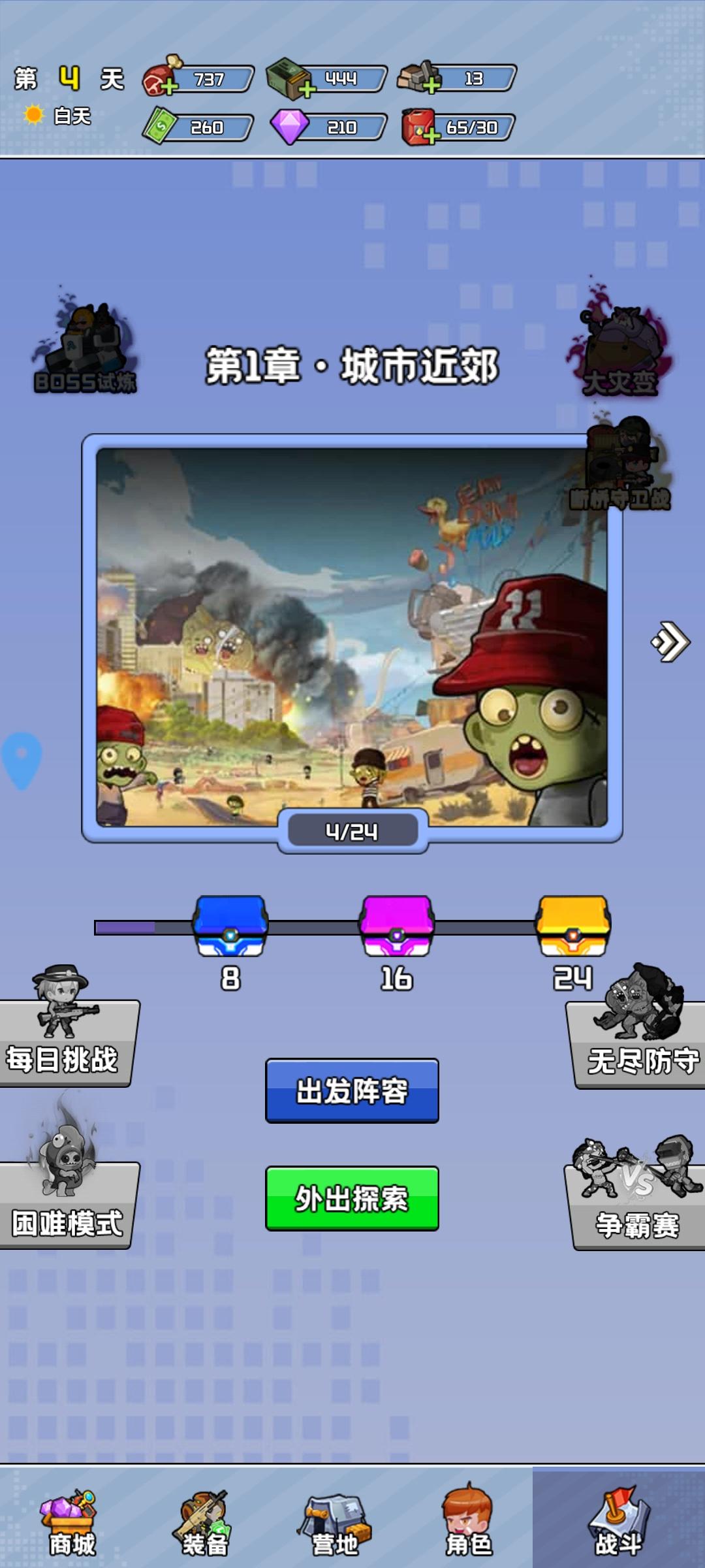 玩法模式很丰富,同一般商业化游戏一样,前期主线推关,逐步解锁扩展玩法,包括每日挑战、无尽防守、BOSS挑战、大灾变等,内容倒是挺多。大部分同质化现象严重,听名字就知道玩法内容,没什么新意。
