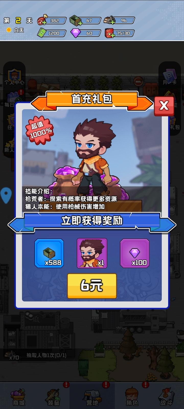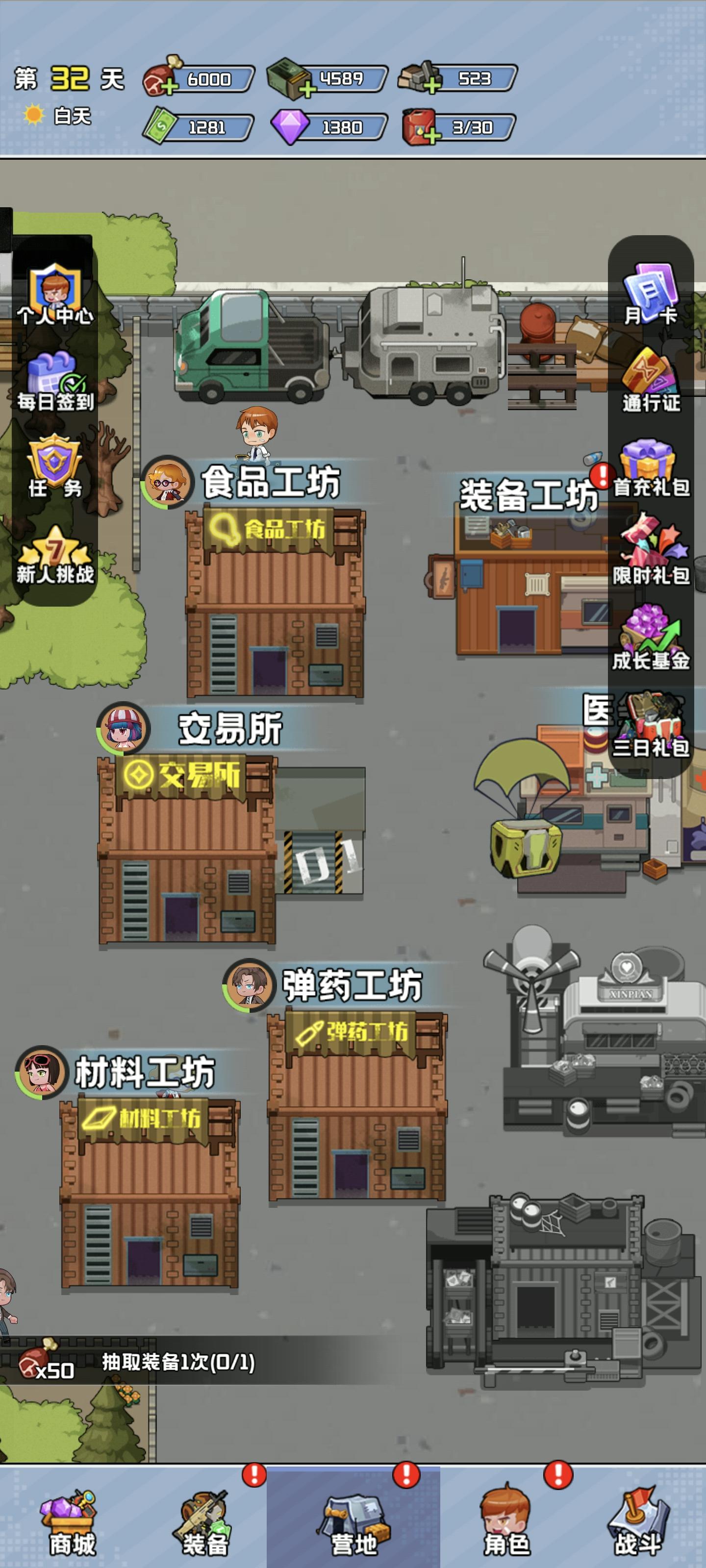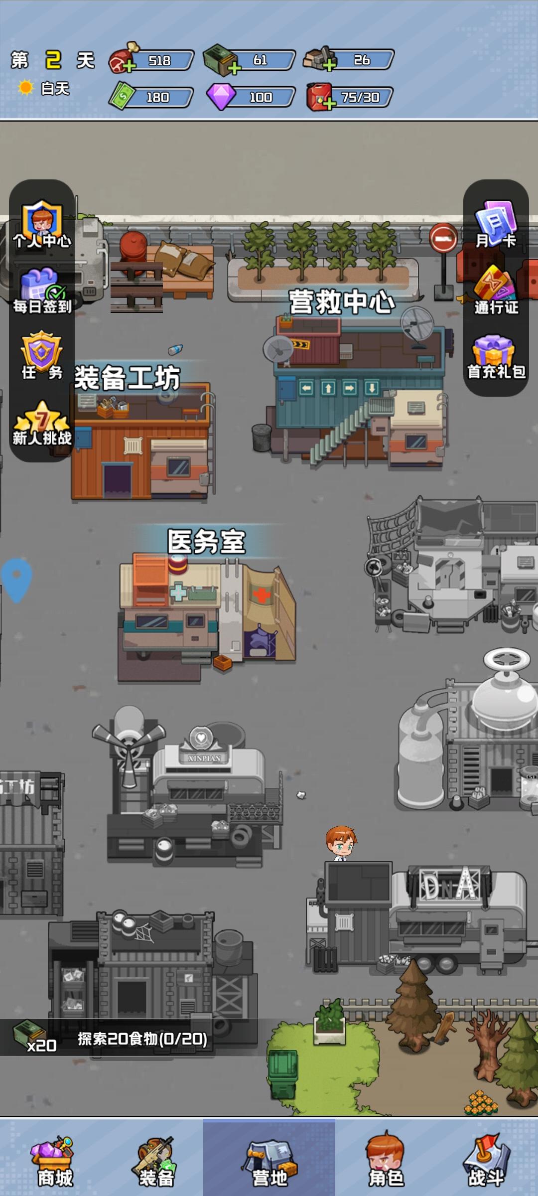 2D卡通画风,界面结构简单,UI品质同小游戏效果。营地内有很多功能建筑,都需要解锁才能使用,不同阶段目标很清晰。角色造型带了点经典电影形象的影子,辨识度不是很高,可能也怕高。