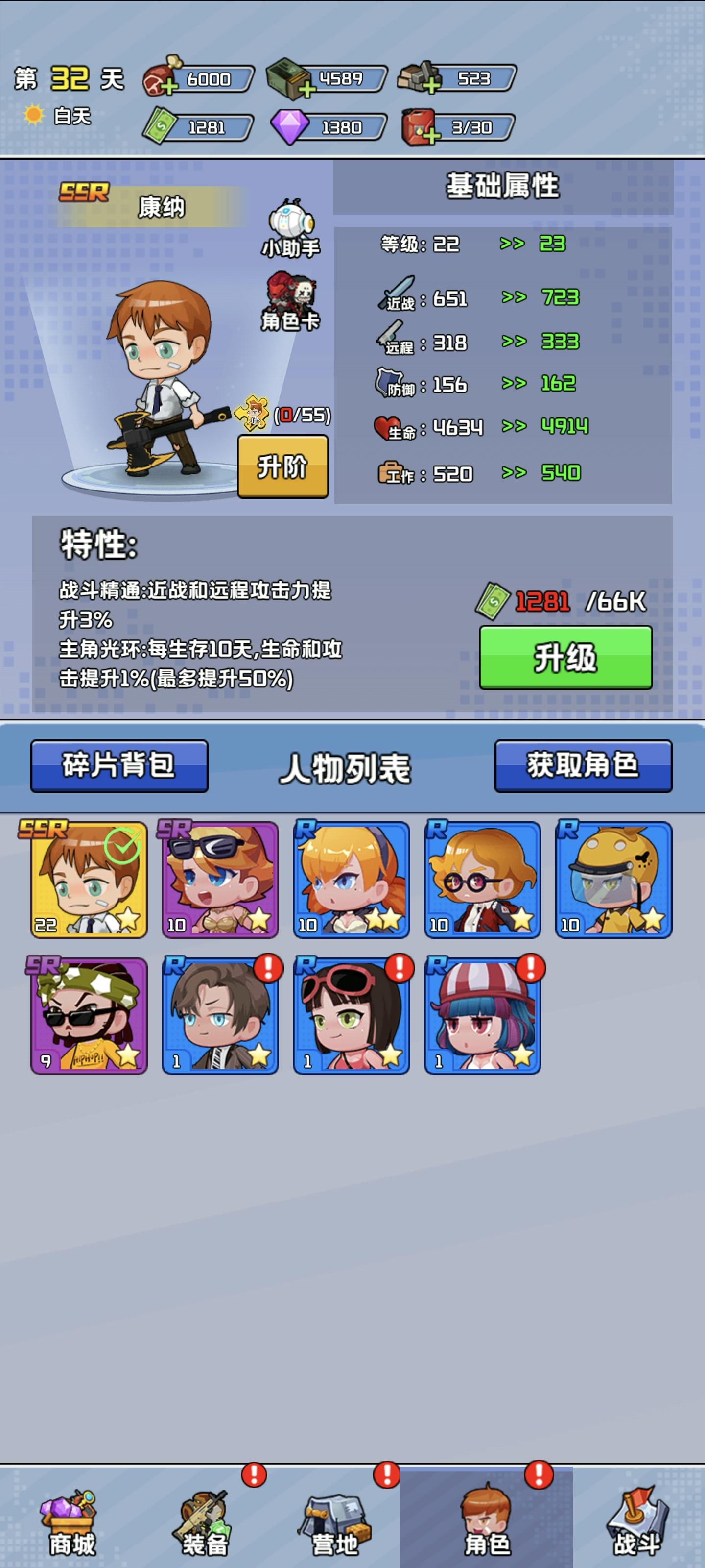 角色总计20名,最大上阵四名,养成可以对已有角色进行升级和升阶,品级从R一直到SSR都有,获取主要靠抽。同界面还有小助手,一共五种,解锁后才能使用。