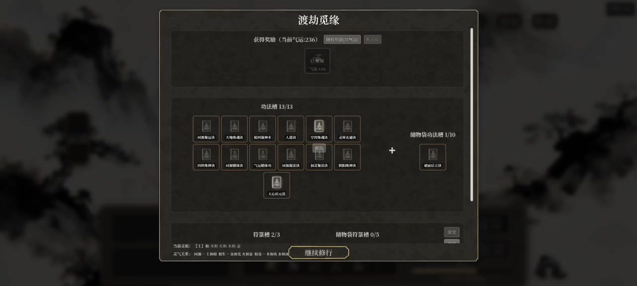 同源流功法真是究极无敌,纯粹的数值。 开局一本同源锻体决,每有一个土、暗灵气就加二十体,直接前期无压力,无灵根的各种削弱跟没有似的。恰好还来了个暗符箓,直接开局启动。 同源聚运决也来的恰是时候,来的还算早,配合暗灵气直接爽赚气运。 后期就是照常叠魂,人道诀和轮回凝神术是必拿的,气运多的话必拿空窍炼魂诀,玩暗灵气必拿灵犀玄通录。 雷火流我没玩,但是想必没有土暗流爽,土暗流配合同源聚运决,那是气运滚滚