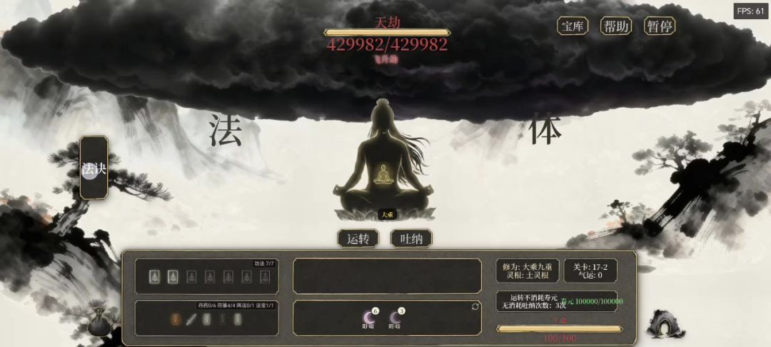新版无灵根飞升,新版太简单了,只是拉低了上限而已,功法槽都不好刷了。老版那个降低倍率才算难。 依旧是暗灵气,感觉暗灵气比雷灵气更容易成型,毕竟那么多灵气你要删到什么时候去?暗灵气运转两三次就基本能稳定凑够暗灵气了。 而且暗灵气上限也高太多,很多功法是要求洞府内灵气数量的。