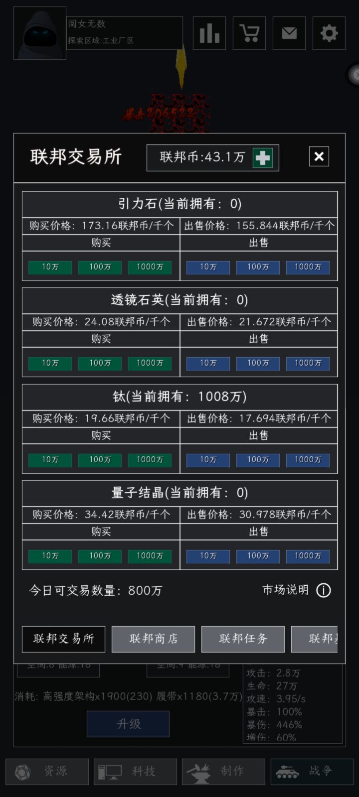第二个我觉着友好的系统是联邦交易。这里即可购买自己需要的原料(当然原料不是固定的,每天在总量几十的原料里面随机开放一部分原料交易),也可进行投资低买高卖赚取利润(qq有联邦炒矿群按照每天公告买卖即可)。联邦交易还有任务系统,他是完成任务后才会自动刷新任务(可手动刷需要的任务),挖矿换钱换箱子换芯片,也可吧多余原料换奖励。