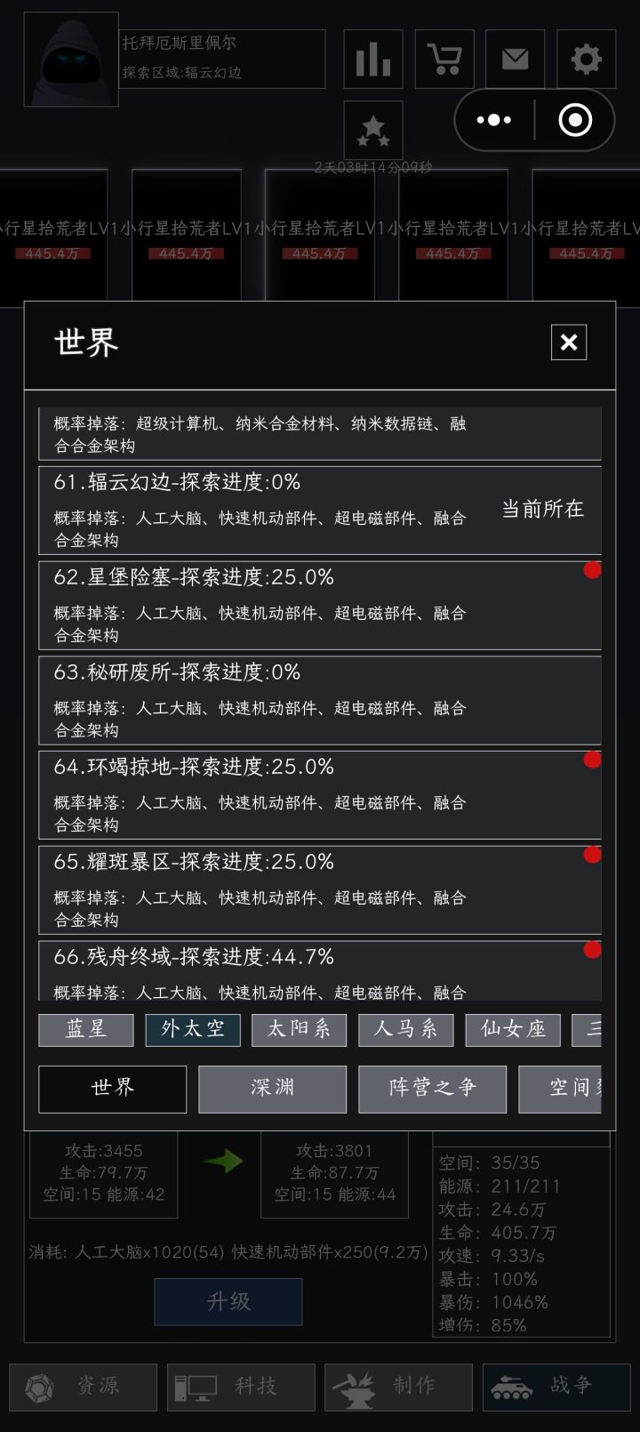 总的来说,游戏分为四个板块第一个资源板块工人:尽可能获取更多的工人,推图隔几个楼层,深渊隔几个楼层都会给一个工人,新区q群会有两个兑换码也有工人,商城有数据币工人礼包,(建议优先购买永久卡 月卡,不得不说这游戏福利是真的好,数据币来源挺广泛的)资源的分配资源加速卡:需要什么矿挖什么,在短时间拿不到工人的情况下推荐使用资源加速卡(加速10分钟),这玩意在走出蓝星前没必要留着,注意的是别一次使