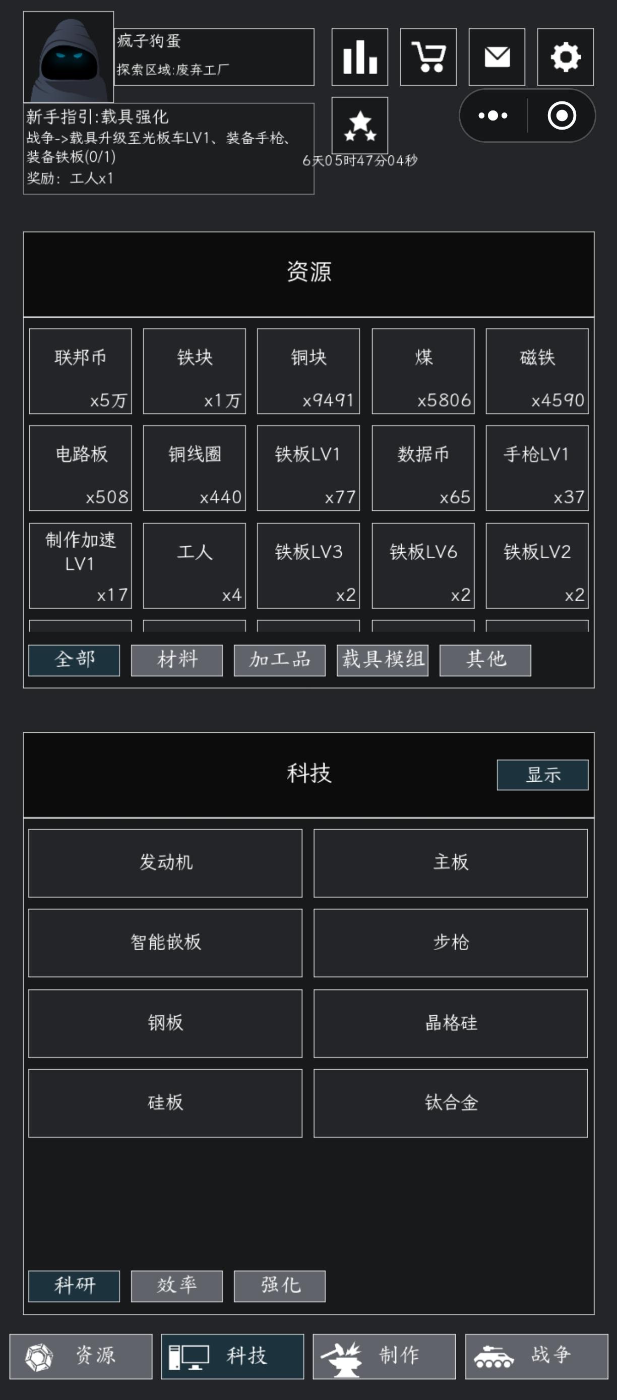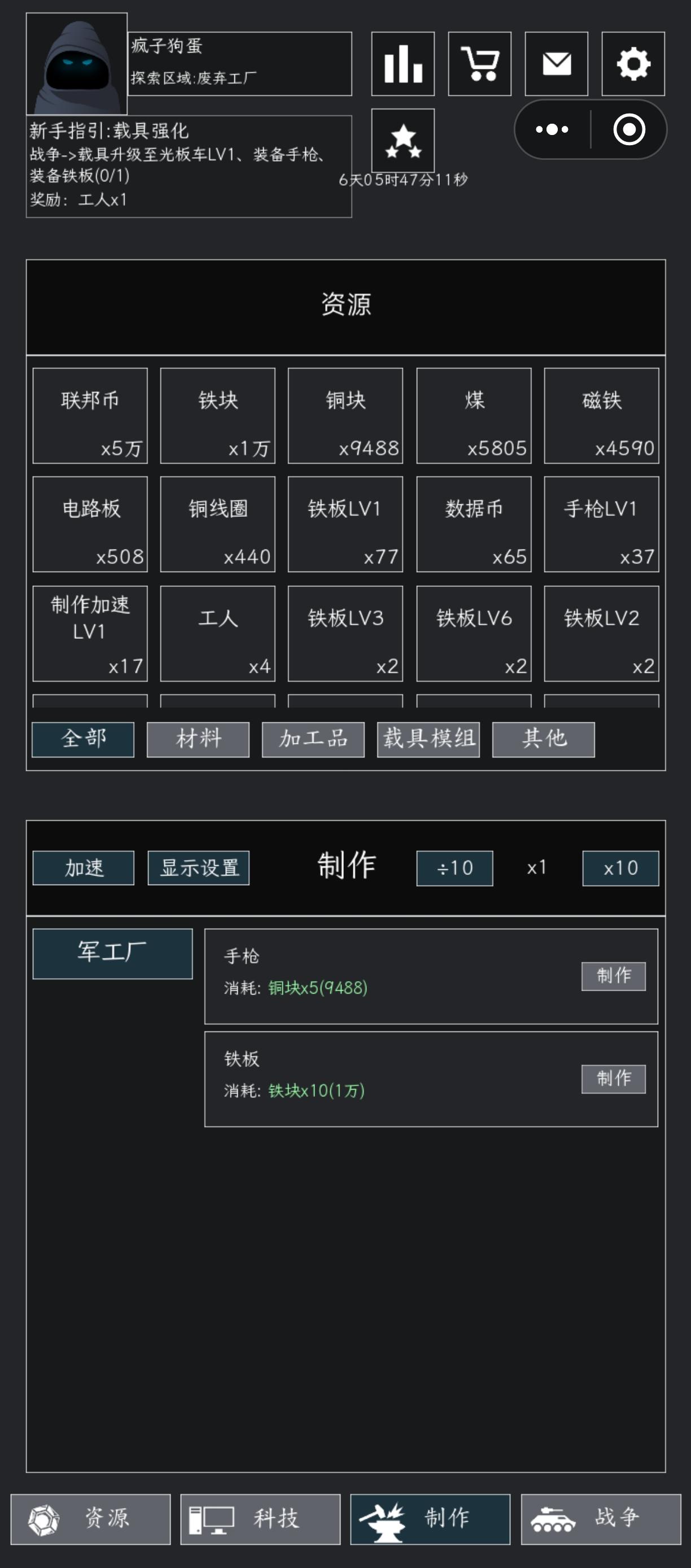 新手入门☞进阶版开局礼包码:加群福利,联邦福利,星火兵工厂12(12月),bgcgl。☞开启转盘,第一个考验运气的时候。开局福利领完工人应该有7个:铁4,铜1,煤1跟着新手任务走,打完第一个BOSS接着去打深渊第5关。这个时候应该有10个工人。建议铁5,铜2,煤3。进入正题:先秒钢铁科技,和主板,发动机。去制作空间扩展1需要的材料。空间1秒出来,不然上不了机枪秒武器线科技,秒到机枪这